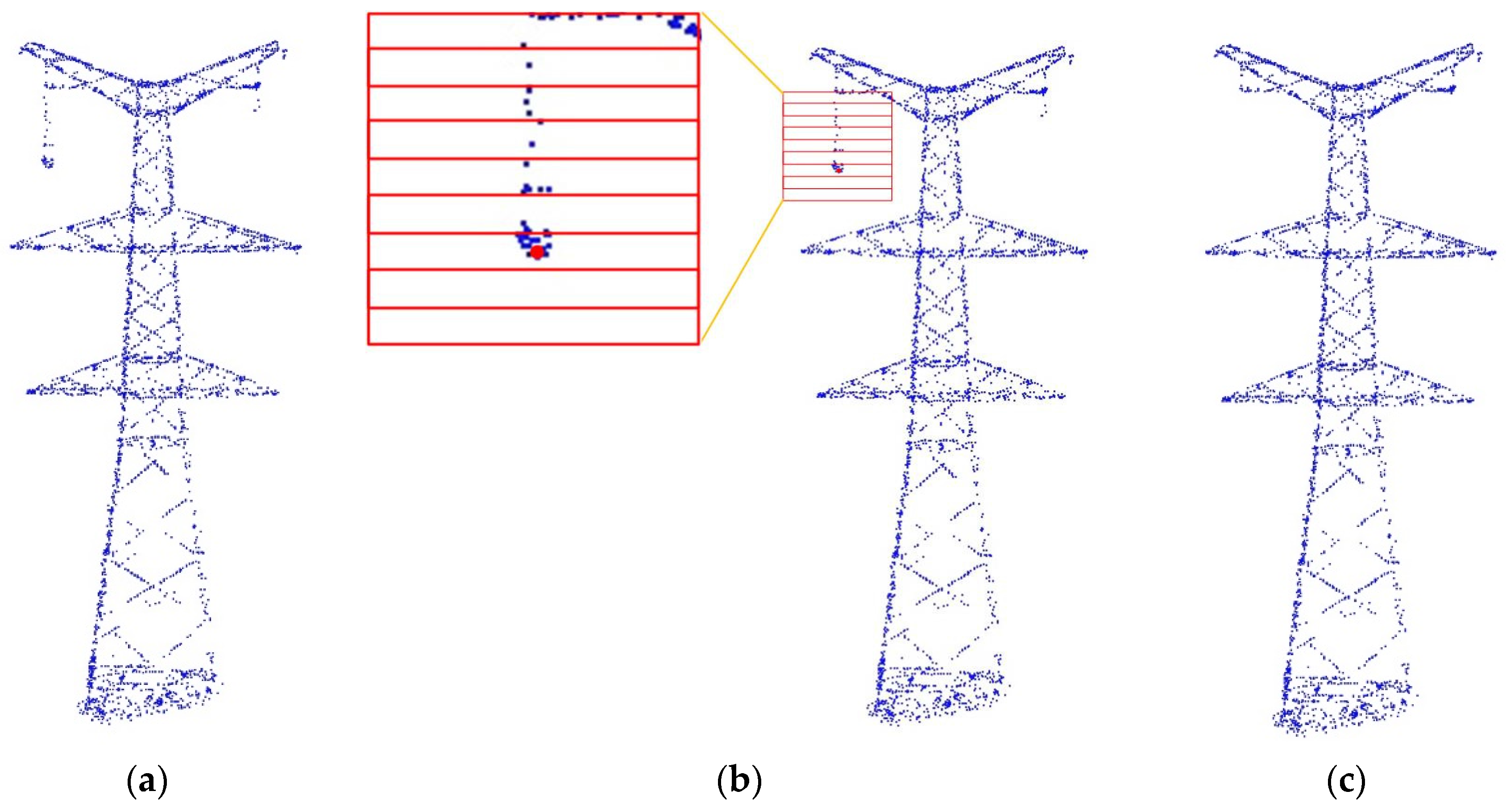 (1) In power engineering, pylons are built with regularity that can be parameterized. Parameterized models can provide important semantic knowledge, e.g., the height of pylons and the length of arms. In this way, an efficient library can be generated as objects, which are defined by the parameter sets. This approach therefore guarantees the robustness of the reconstruction by introducing the regularity, which can overcome the defaults of reconstruction errors due to tiny data loss.