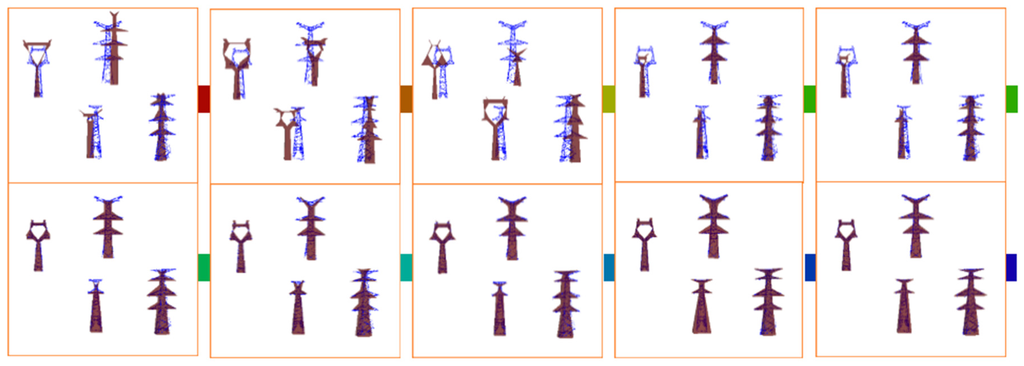 Model-based methods can be used to reconstruct objects with constant parameters or construction rules. These methods are known to be robust with respect to data quality, and are suited to large scenes. As for power lines, McLaughlin defined the parameters of a model, and extracted each individual transmission line span from classified power-line point cloud data []. Based on RANdom SAmple Consensus (RANSAC) rule, Guo et al. proposed an improved approach for power-line modeling [].