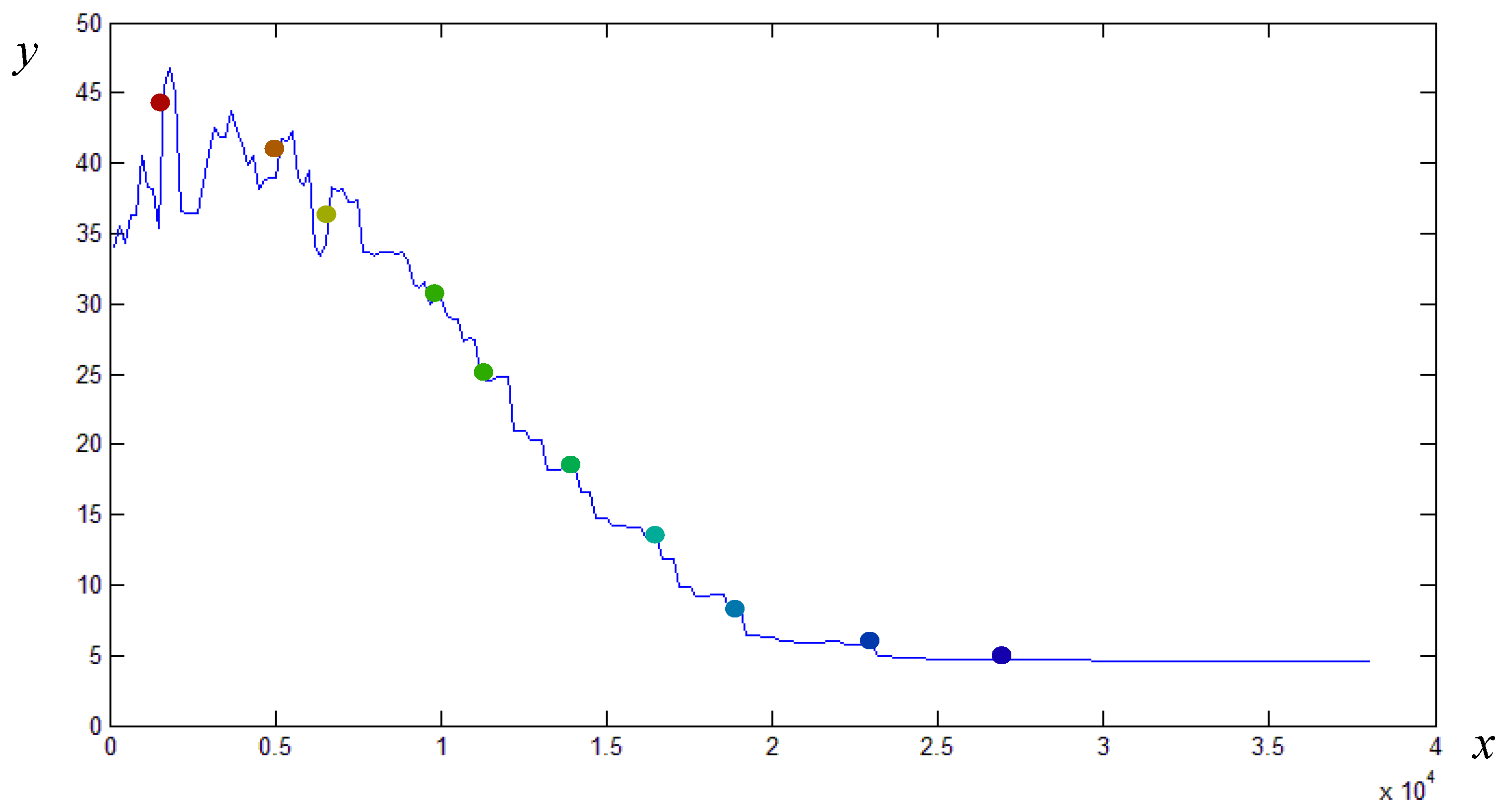 Energy decrease, x = t and y = U, where the circles with different colors represent the temperature corresponding to the optimization process shown in Figure 6.