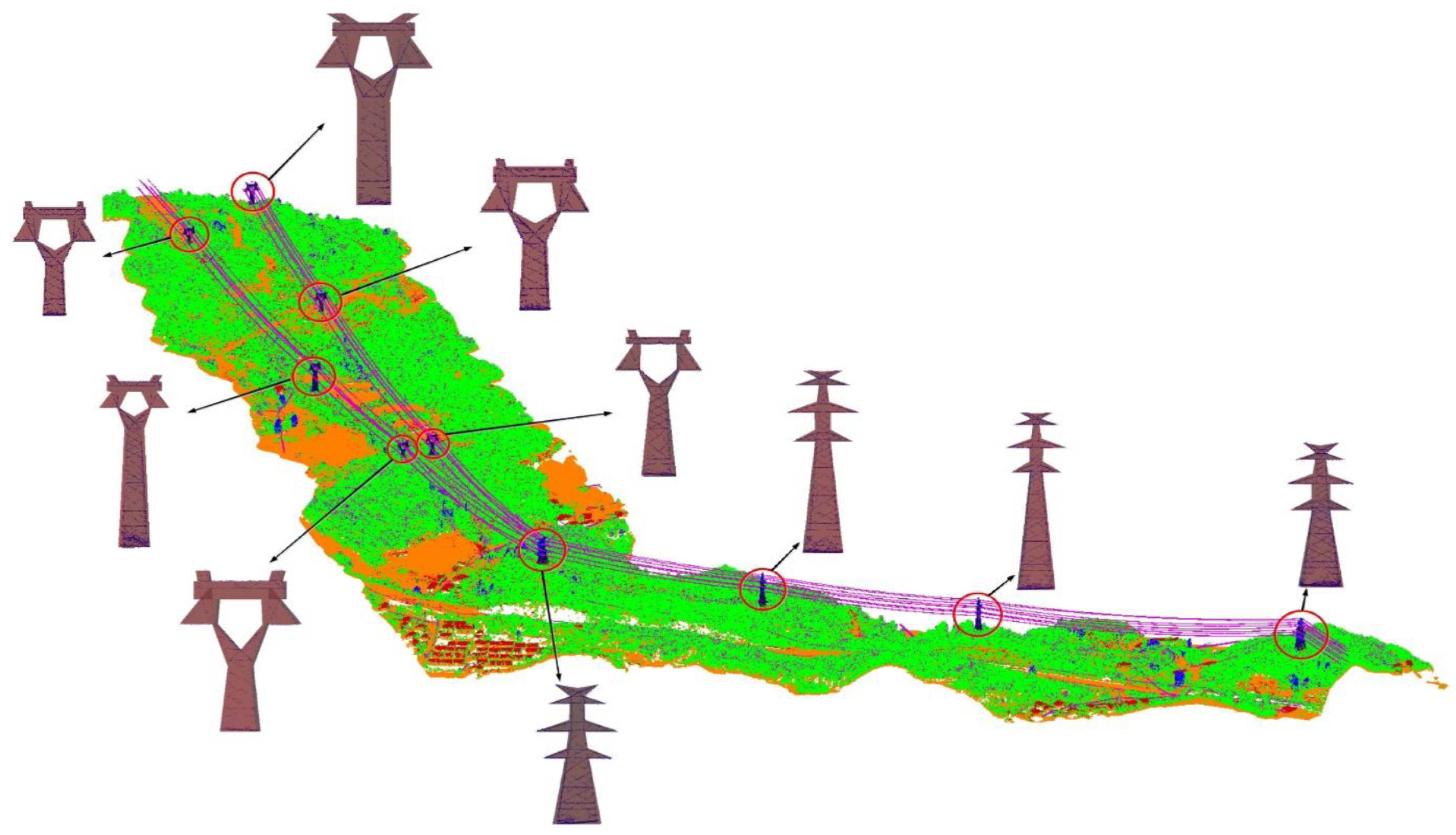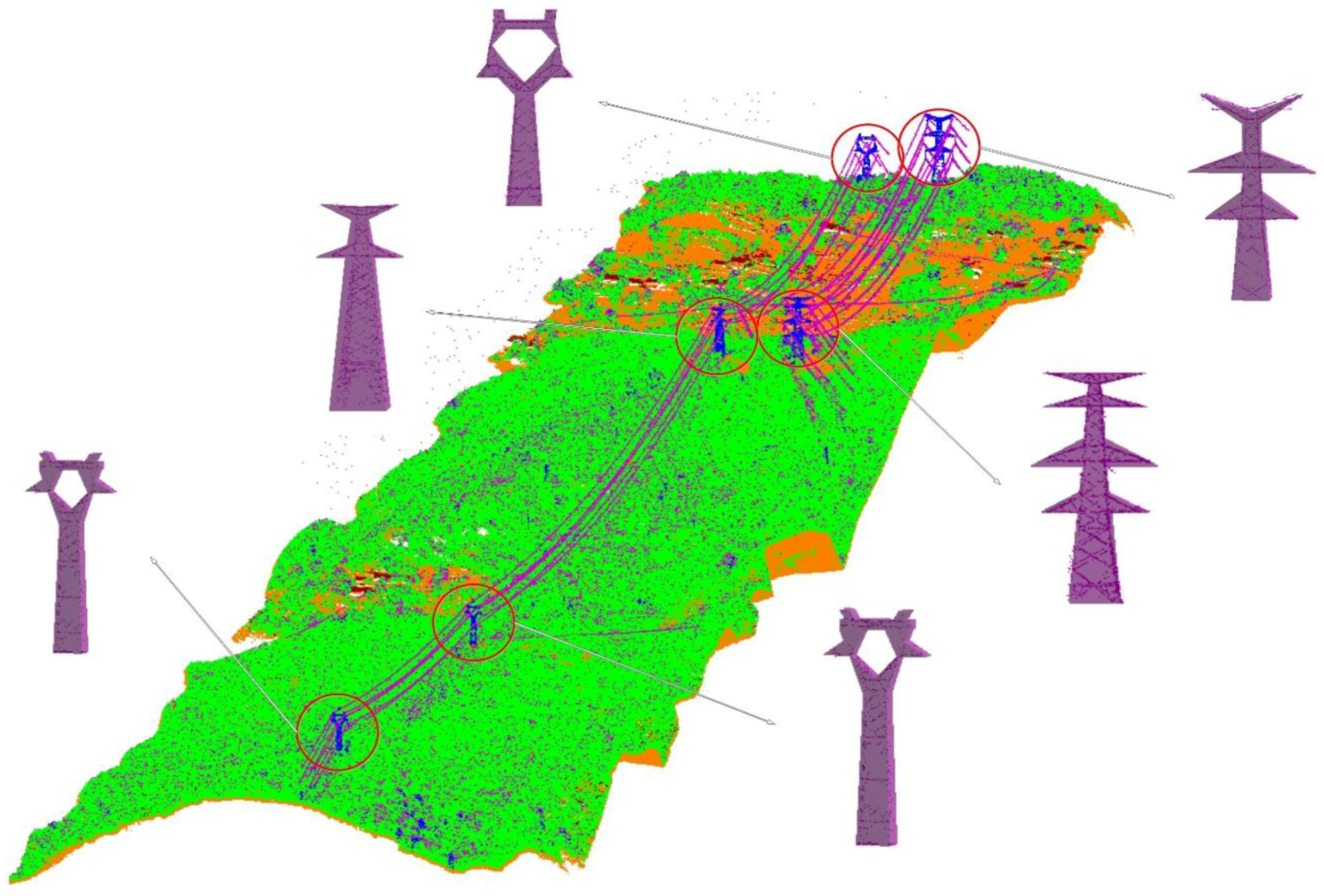 Laser scanning can directly provide 3D point cloud data, which is more advanced than other remotely sensed data (e.g., remote sensing images), for the modeling of complex objects. In 2002, an on-board eye-safe laser radar system capable of measuring the distance between high-voltage power transmission lines and nearby trees was developed [4]. In power-line system surveying, dense points on power lines and pylons can now be accurately measured using laser scanning [7,8].