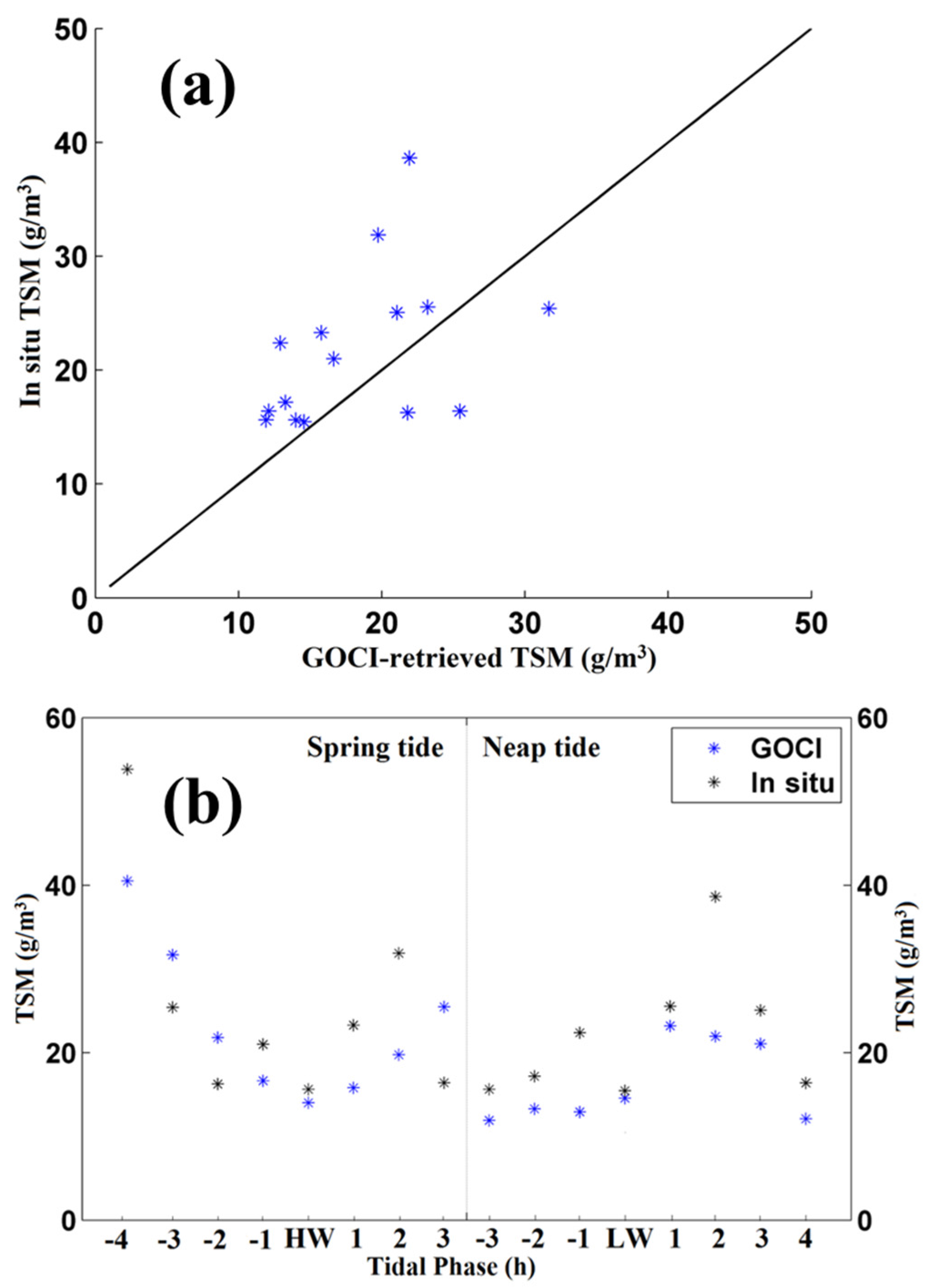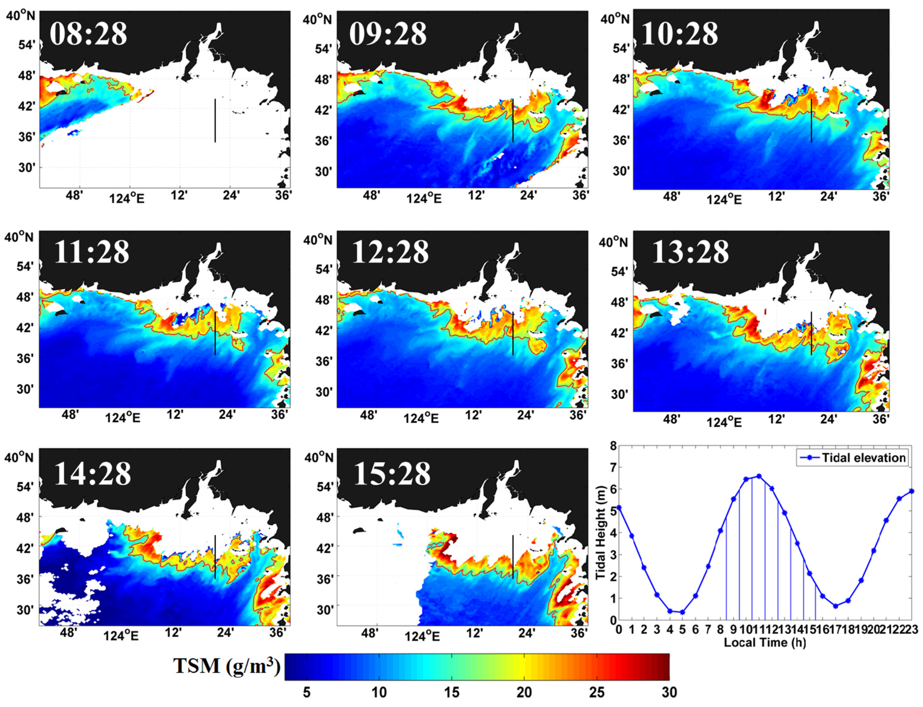 - Shi, W.; Wang, M.; Jiang, L. Spring-neap tidal effects on satellite ocean color observations in the Bohai Sea, Yellow Sea, and East China Sea. J. Geophys. Res. 2011, 116. [Google Scholar] [CrossRef]