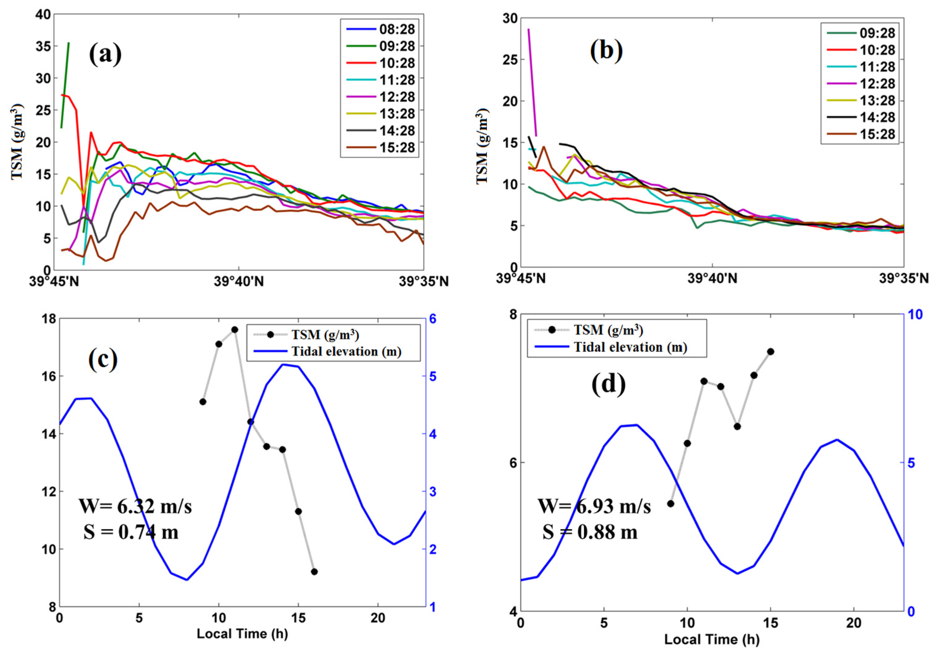 3.2. The Effect of Spring-Neap Tidal Cycle on Diurnal Variation of TSM in the YRE