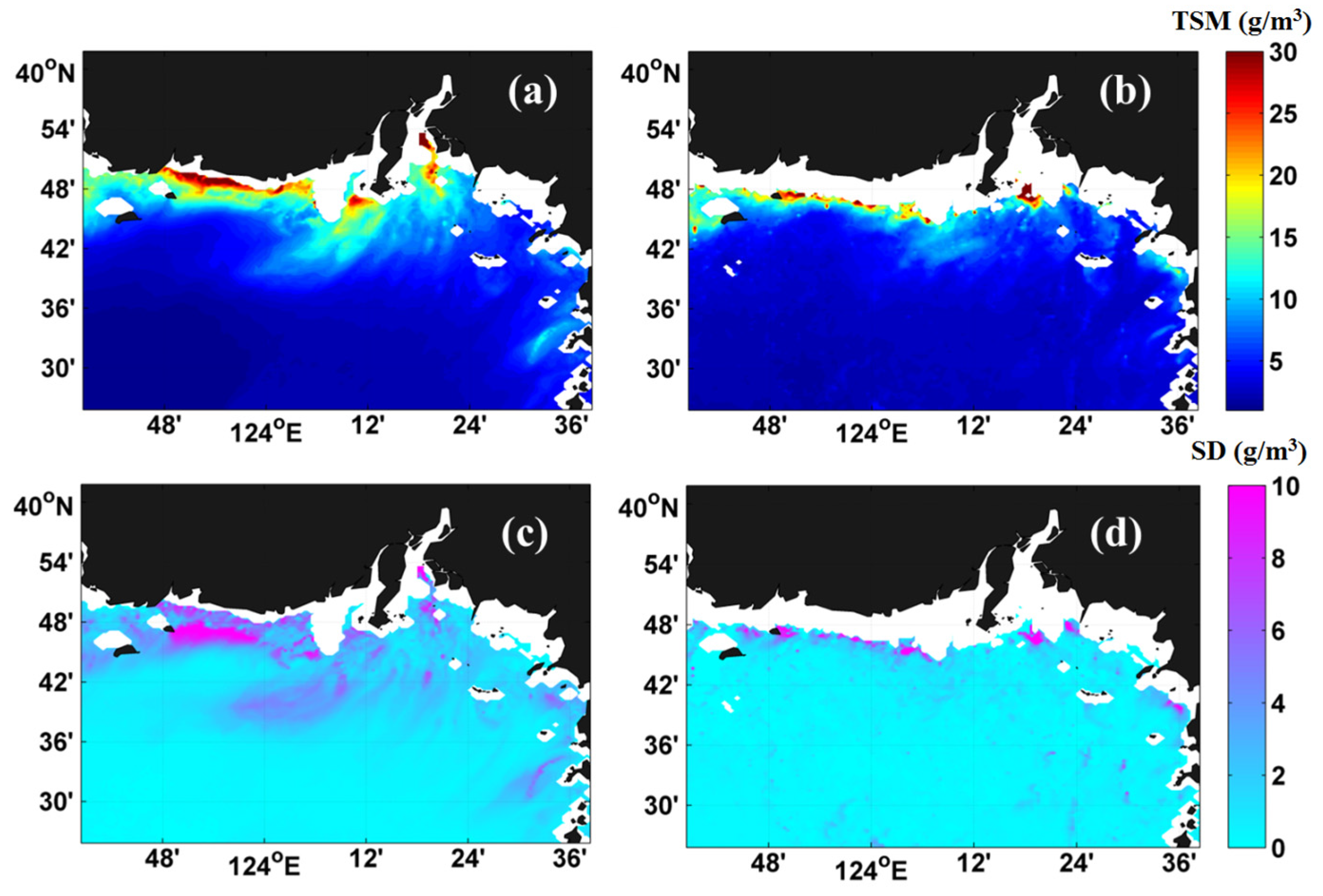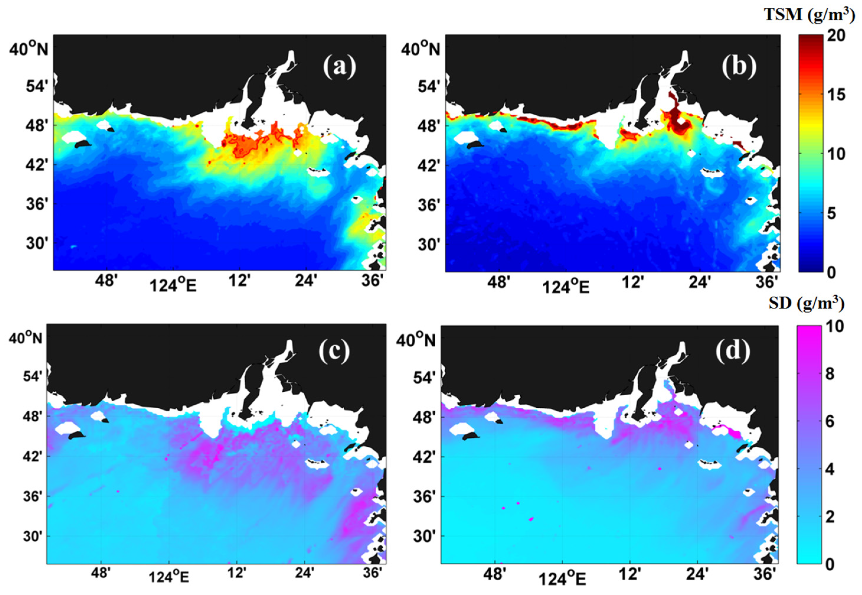 - Ruddick, K.; Vanhellemont, Q.; Yan, J.; Neukermans, G.; Wei, G.M.; Shang, S.L. Variability of suspended particulate matter in the Bohai Sea from the Geostationary Ocean Color Imager (GOCI). Ocean. Sci. 2012, 47, 331–345. [Google Scholar] [CrossRef]