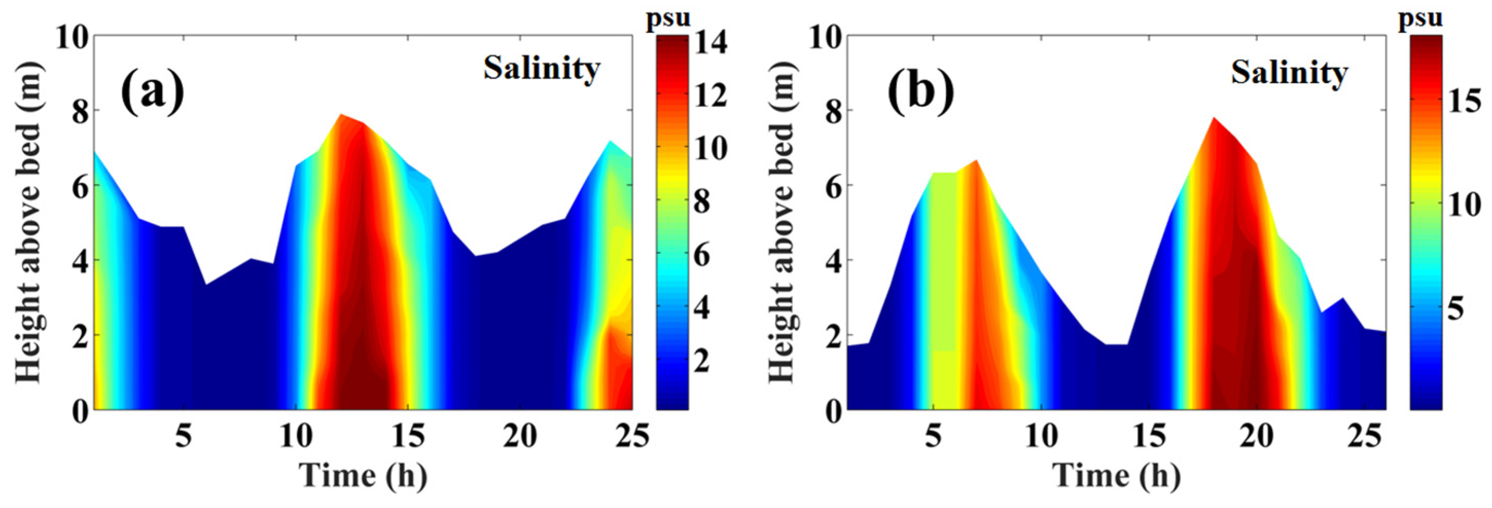 - Blanton, J.O.; Seim, H.; Alexander, C.; Amft, J.; Kineke, G. Transport of salt and suspended sediments in a curving channel of a coastal plain estuary: Satilla River, GA. Estuar. Coast. Shelf Sci. 2003, 57, 993–1006. [Google Scholar] [CrossRef]