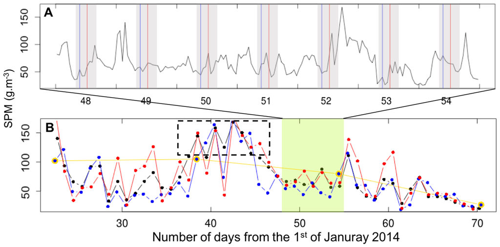 3.3. Impact of Satellite Sensor Temporal Resolution on the Monitoring of SPM Dynamics