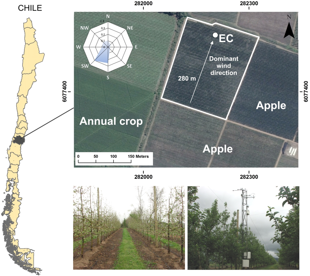 Location of the experimental apple orchard, the eddy covariance flux station and the surrounding fields.