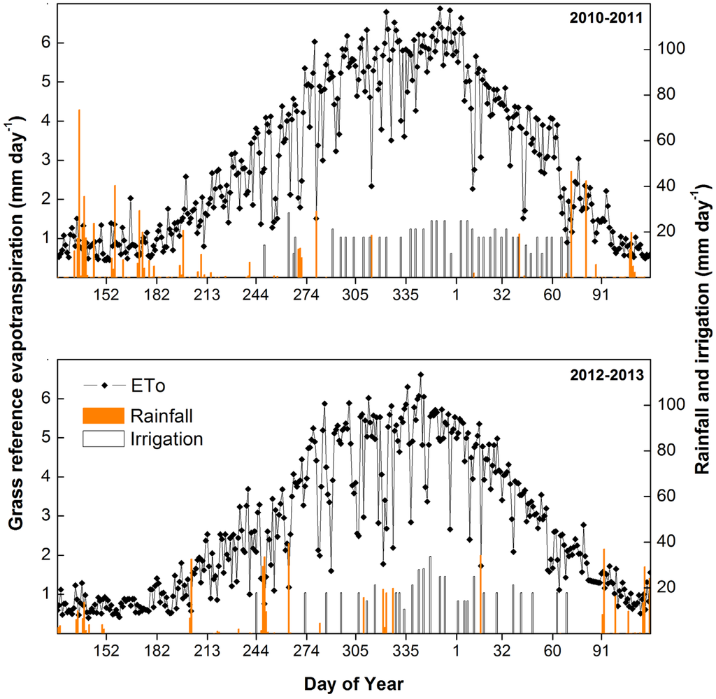 Daily reference evapotranspiration (FAO-56 Penman–Monteith ETo), rainfall and irrigation during the 2010–2011 and 2012–2013 growing seasons.