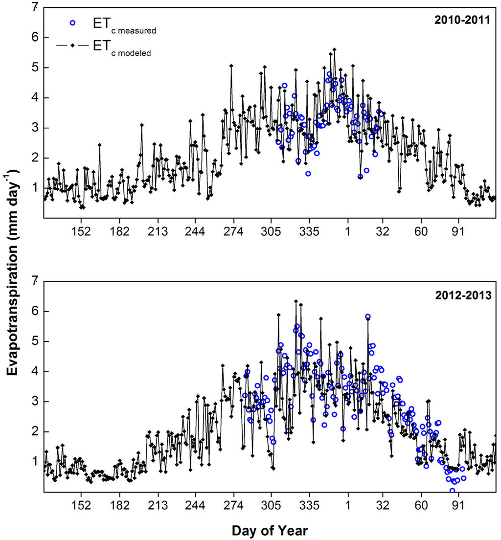 Temporal evolution of measured and modeled evapotranspiration for the drip-irrigated apple orchard (ETc) during the 2010–11 and 2012–13 seasons.