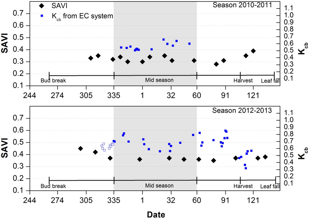 Evolution of the soil adjusted vegetation index (SAVI) and the basal crop coefficient from the eddy covariance system (EC) for the drip‑irrigated apple orchard during the 2010–11 and 2012–13 growing seasons. Shaded areas represent the midseason growth stages. Unfilled squares represent the period with apple-weeds cover mixture.