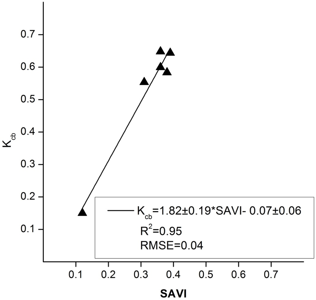 Kcb-SAVI linear relationship for the studied apple orchard. Kcb values at effective full cover correspond to the apple canopy without weeds.