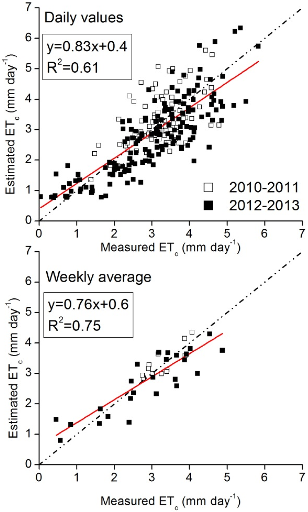Daily and weekly values of measured and estimated ETc were compared by using a linear regression analysis and a series of statistics described by [55]: RMSE, mean absolute error (MAE), mean bias error (MBE) and index of agreement (d) used as a relative measure of the difference among variables. Perfect agreement would exist between observed and modeled values if d = 1. Additionally, the relative RMSE and relative MAE were provided to evaluate the models performance [56].