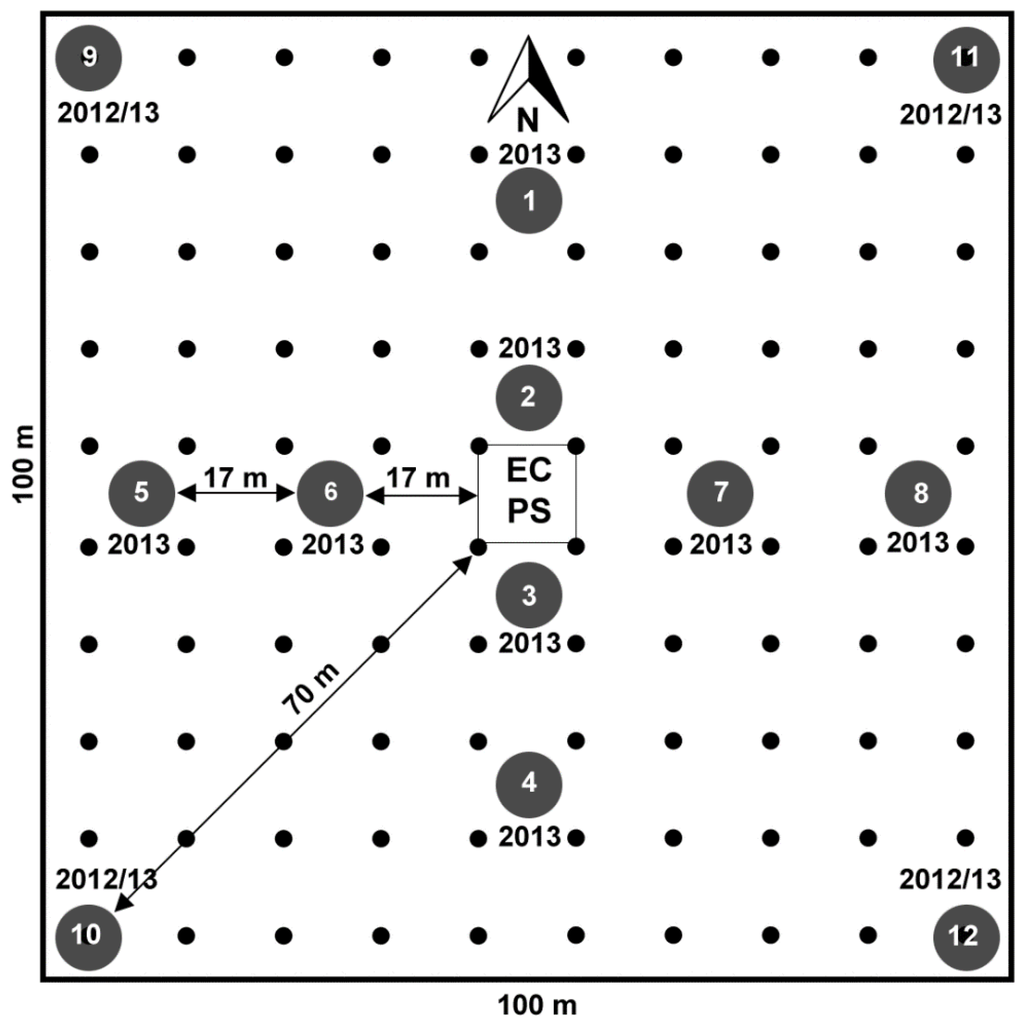 Figure 2. Optical and biomass sampling design around each eddy covariance (EC) and phenology station (PS) location. Canopy-level NDVI680,800 was sampled at regular intervals within a one hectare region surrounding each flux tower using 10 m grid spacing (approx. 100 samples; sampling locations represented by black dots). Biomass sampling and fAPARgreen calibration occurred at the locations indicated by numbered circles (1–12), with the sampling years indicated by each circle. - -