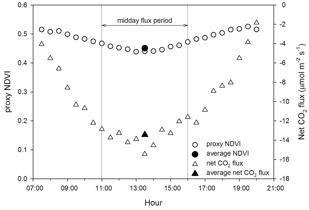 When comparing proxy NDVI to CO2 fluxes, both datasets were averaged for a 5-h interval around solar noon (11 am–4 pm; Figure 4) and these values were used as the daily value for flux and proxy NDVI, respectively. These midday average values were then used to model and fill data gaps in the flux data from optical measurements.