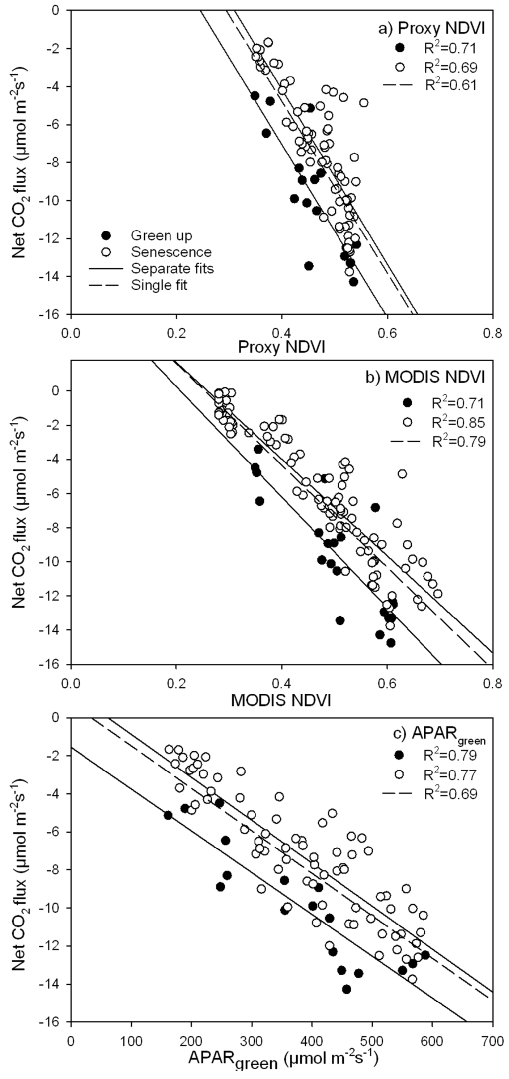 The following are available online at http://www.mdpi.com/2072-4292/8/3/260/s1, Table S1: R2 and equations for fits between net CO2 flux and different midday averaging period of proxy NDVI calculated both for the full season and for the first and second halves (green-up and senescence). The average intervals considered were 5-h, 3-h and 1-h around midday (approximately 13:30 local daylight savings time). In all cases, proxy NDVI was filtered with the method explained in the text.