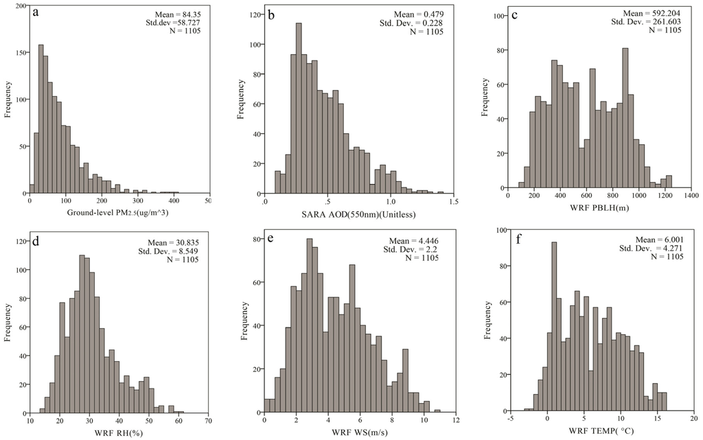 Histograms and descriptive statistics of six variables ((a) Ground-level PM2.5; (b) SARA AOD; (c) WRF PBLH; (d) WRF RH; (e) WRF WS; and (f) WRF TEMP).