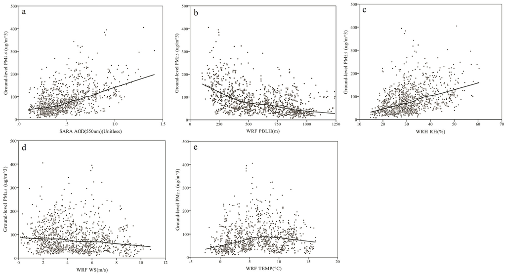 For further understanding the response of ground level PM2.5 concentrations to meteorological condition changes, the LOESS (locally weighted polynomial regression) trend lines were added in the scatter-plots between ground level PM2.5 and the predictors in SPSS (Figure 3). LOESS combines the simplicity of linear least squares regression with the flexibility of nonlinear regression and fits simple models to localized subsets of the data []. It shows that SARA AOD and RH seems to be significantly associated with ground level PM2.5 concentration in a nearly positive linear model (Figure 3a,c), while PBLH and WS fit with a nearly negative linear model (Figure 3b,d). Ground-level PM2.5 concentration increases when the TEMP is below around 7 °C, but decreases as the temperature gets higher than 7 °C (Figure 3e).
