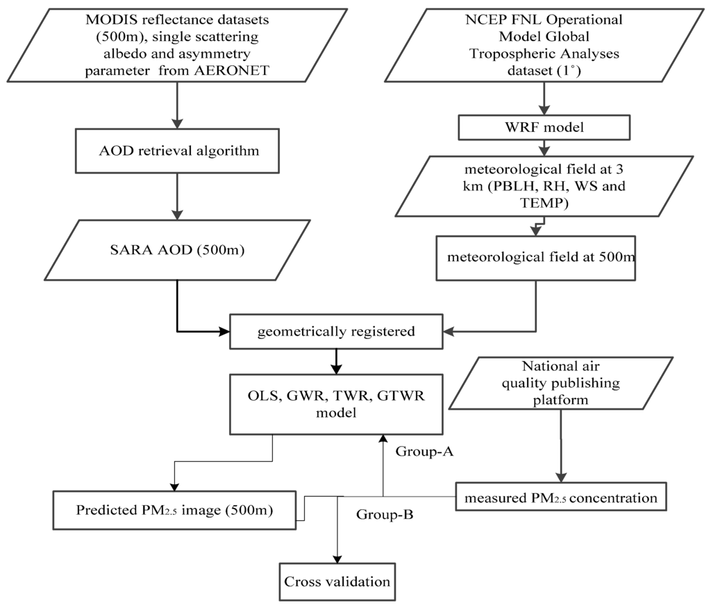 Figure 4 presents a flowchart of the proposed estimating method. The Terra/Aqua MODIS level-1 and level-2 products with aerosol properties, including SSA and asymmetry parameter obtained from AERONET, are first employed to generate AOD images with 500 m spatial resolution at the satellite overpassing moment based on SARA. Then, meteorological field images including PBLH, RH, WS, and TEMP are extracted from WRF assimilation, and are geo-registered and interpolated to the same coordinate system and the same spatial resolution of SARA AOD by using a cubic spline interpolation algorithm. Finally, hourly PM2.5 concentration maps at 500 m resolution were produced using SARA AOD products and meteorological field datasets with four models including GTWR, ordinary OLS, GWR, and the TWR model, respectively. Only the data spatially co-located at the selected 37 ground stations and temporally matched with MODIS overpassing moments were included in the following analyses. More details are given in Table 1.