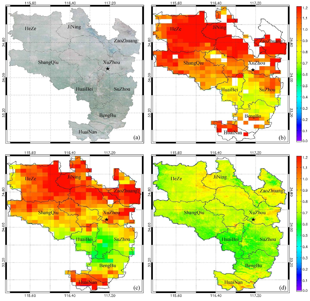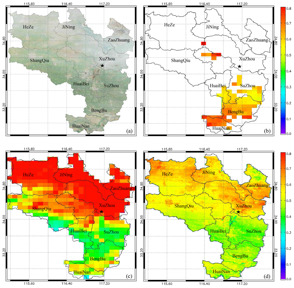 Contrast of satellite-derived AOD results in the study region on 11 January 2015. (a) True color (RGB:143); (b) Terra DT AOD at 10 km; (c) Terra DB AOD at 10 km; (d) Terra SARA AOD at 500 m.