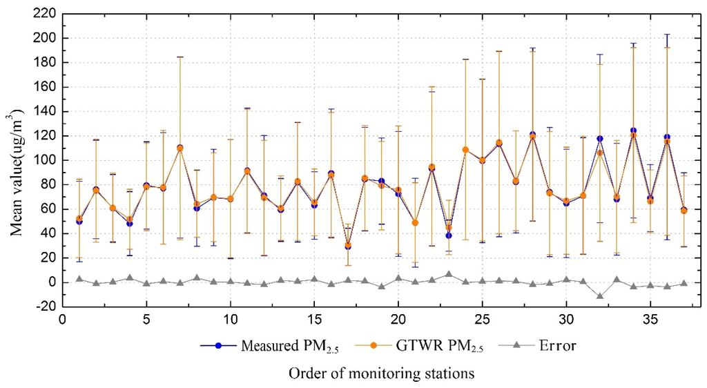 To further evaluate the performance of the GTWR model, all the PM2.5 measurements from 37 monitoring stations were used as a training dataset (N = 1105). Figure 7 quantitatively illustrates the mean difference between the GTWR estimations and ground measurements at 37 monitoring stations. It shows that the GTWR estimations agree well with the ground measurements. The PM2.5 discrepancies vary from 6.61 μg/m3 (as the ground measurement is 38.35 μg/m3) to −11.72 μg/m3 (as the ground measurement is 117.79 μg/m3). Around 94.6% of the GTWR estimations correlate well with ground measurements at very low discrepancies (e.g., with the error less than 4.0 μg/m3).