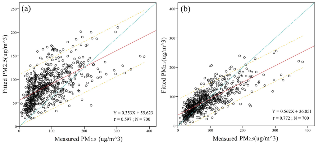 Figure 8 and Figure 9 give the scatter plots between measured and fitted PM2.5 concentrations with OLS, GWR, TWR, and GTWR model, respectively. All the slopes (0.35, 0.56, 0.61, and 0.94 for model fitting, and 0.38, 0.57, 0.63, and 0.89 for cross validation, respectively, for the OLS, GWR, TWR, and GTWR models) of the above four models are smaller than 1. This characteristic implies that most of the PM2.5 concentrations are systematically underestimated both in model fitting and cross validation. Figure 8a and Figure 9a show that few estimations of OLS (r = 0.60 and 0.65 for fitting and validation, respectively) lie close to the 1:1 line, and a wide scattering of points is seen due to underestimation and overestimation. Figure 8b and Figure 9c show that the GWR estimations have comparable correlation coefficients (r = 0.77 and 0.80 for fitting and validation, respectively) with TWR estimations, and the r of both GWR and TWR are greater than OSL. This tells us that spatial and temporal variability should be considered in the linear regression model. Figure 8d and Figure 9d show that the majority of the GTWR estimations (r = 0.98 and 0.93 for fitting and validation, respectively) are close to the 1:1 line and fall in the 95% confidence envelope. They also show that when the ground measurement is lower than 100 μg/m3, the estimations have a relatively good quality except for OLS; when the ground measurements become larger than 150 μg/m3, the performance of GTWR is far better than the other three models. In a word, the GTWR model displays the best performance both for model fitting and cross validation.