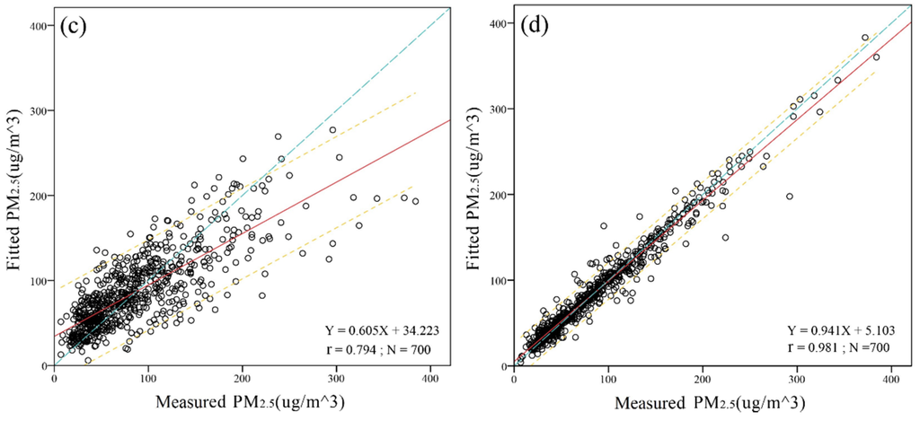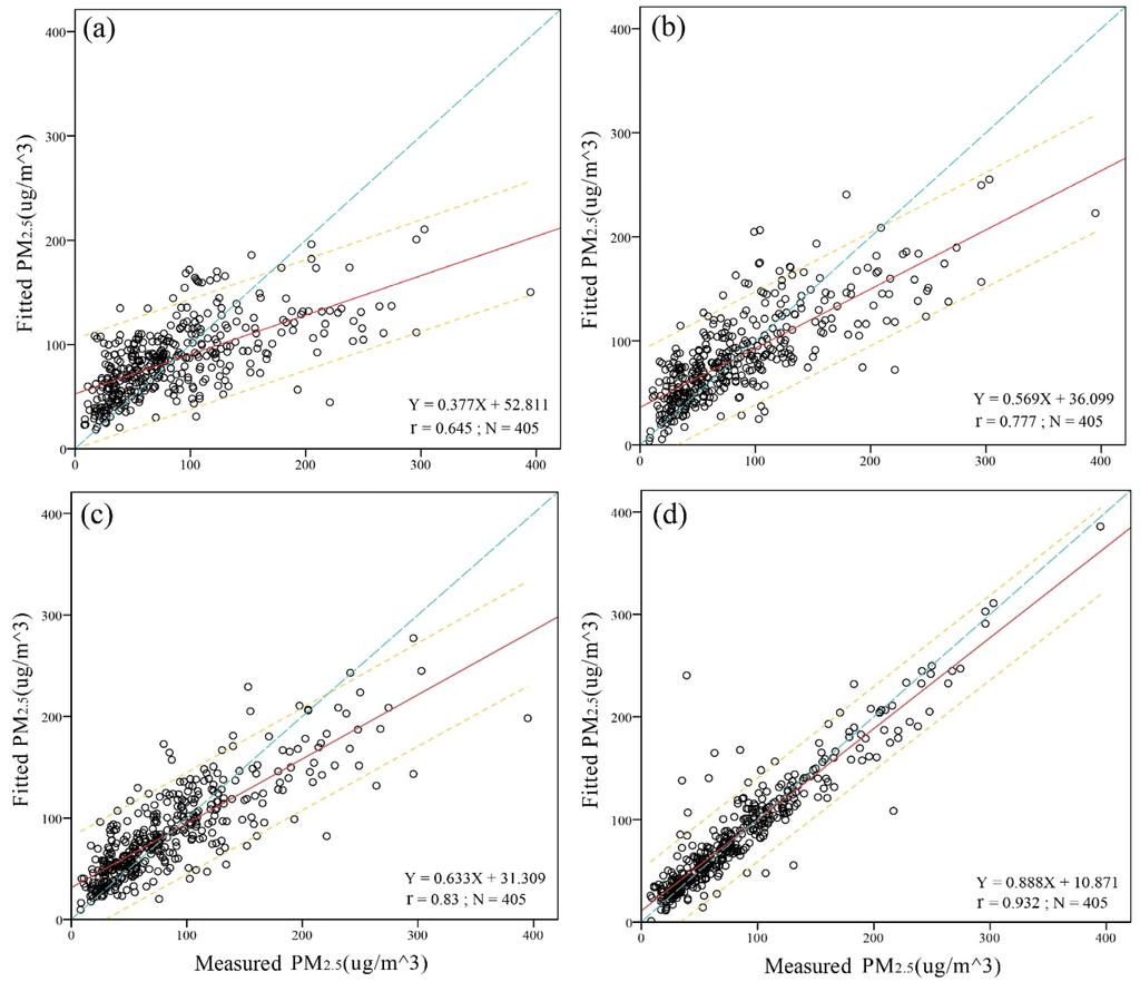 Scatter plots between the measured and fitted PM2.5 concentrations for model fitting. (a) OLS; (b) GWR; (c) TWR; and (d) GTWR. The short dashed (orange) line, long dashed (blue) line, and solid (red) line are the 95% confidence band, 1:1 line, and regression line, respectively.