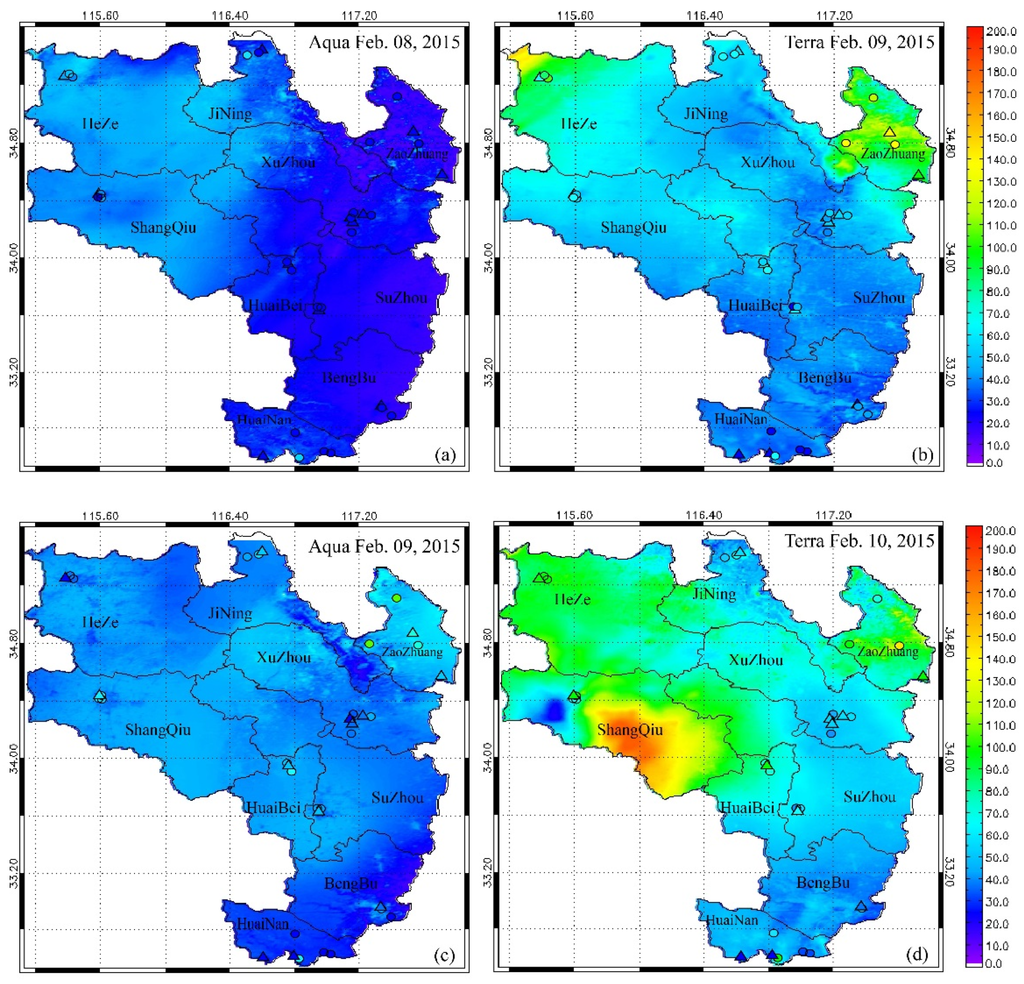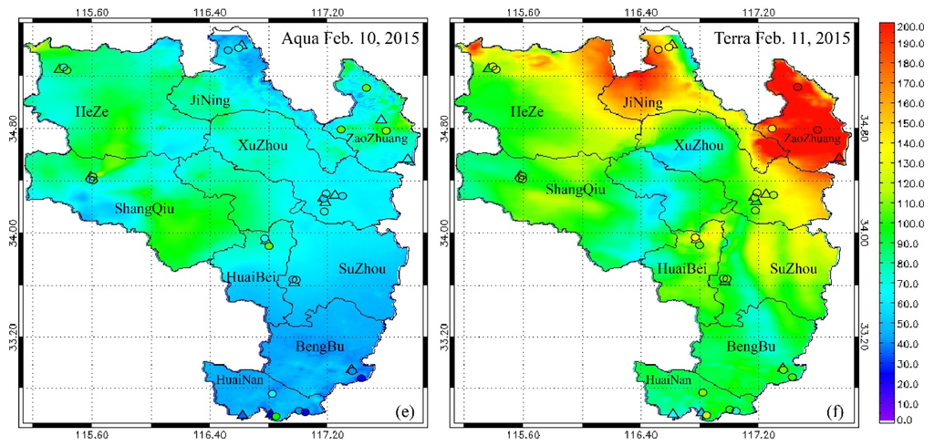 Figure 10 illustrate the spatio-temporal distribution of PM2.5 hourly concentrations estimated from MODIS SARA-AOD with GTWR model during a haze formation process from the afternoon of 8 February 2015 to the morning of 11 February 2015. On 8 February 2015, the pollution is concentrated over HeZe, ShangQiu, and the west part of JiNing with PM2.5 concentrations ranging from 60 μg/m3 to 70 μg/m3 when the other six cities are not yet polluted (Figure 10a from Aqua). Then, the pollution is extended to the south and east, and brings higher PM2.5 to ZaoZhuang, Xuzhou, and the northwest of SuZhou (Figure 10b–e for 9 February 2015 and 10 February 2015). Up to 11 February 2015, the extremely high pollution is centered at ZaoZhuang, JiNing, and the northeast part of HeZe, with PM2.5 concentrations beyond 150 μg/m3. This shows that the PM2.5 concentrations over the study region slowly accumulated during this haze process except for the dramatic increase in ZaoZhuang and JiNing, which indicates that both local and external pollutant sources had an impact on the PM2.5 concentration.
