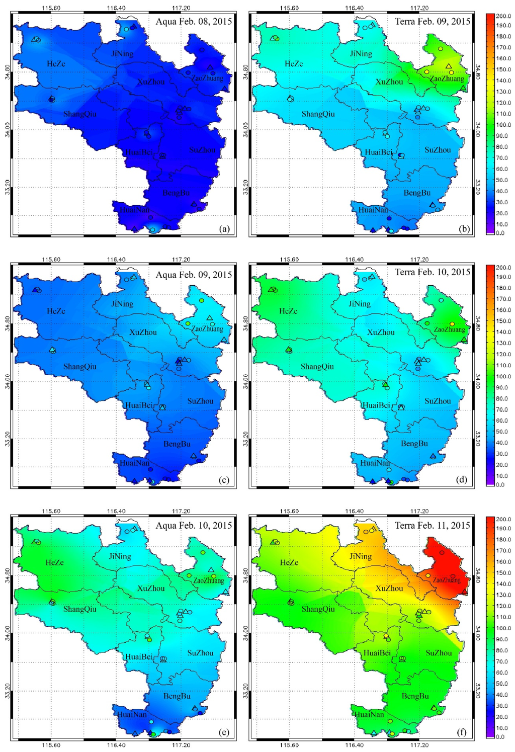 Spatial distribution of ground PM2.5 measurements over the study region during a haze formation process from the afternoon of 8 February 2015 to the morning of 11 February 2015, referring to the local passing moment of satellites Terra and Aqua ((a) Aqua 8 February 2015; (b) Terra 9 February 2015; (c) Aqua 9 February 2015; (d) Terra 10 February 2015; (e) Aqua 10 February 2015; and (f) Terra 11 February 2015). In situ measurements at training stations (circles) and validation (triangles) stations are also shown in the figures.