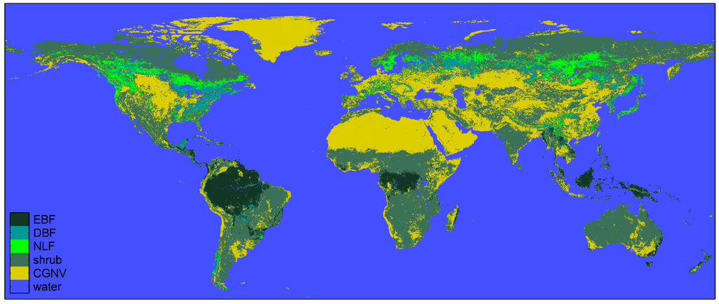 - Classes fusion according to the IGBP land cover as defined in Section 2.3, and