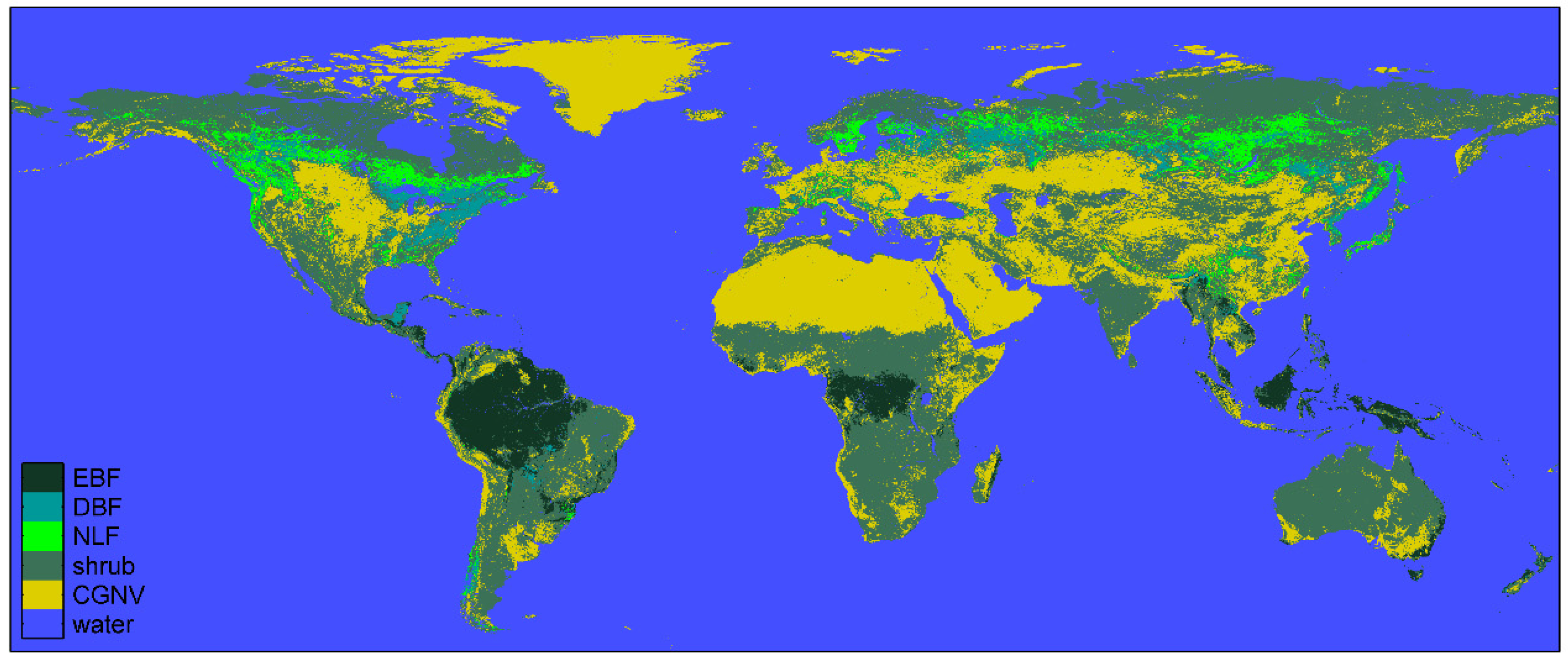 Land cover classification, used to stratify the outputs, follows the 1981–1994 IGBP (International Geosphere-Biosphere Program) map [21]. To avoid inconsistent land cover changes, the same classification is used for the entire dataset. Moreover, to reduce spatial discontinuity, the number of classes was reduced from 17 to 6 (see Table 1). A global map depicting the land cover categories used is shown in Figure 1.