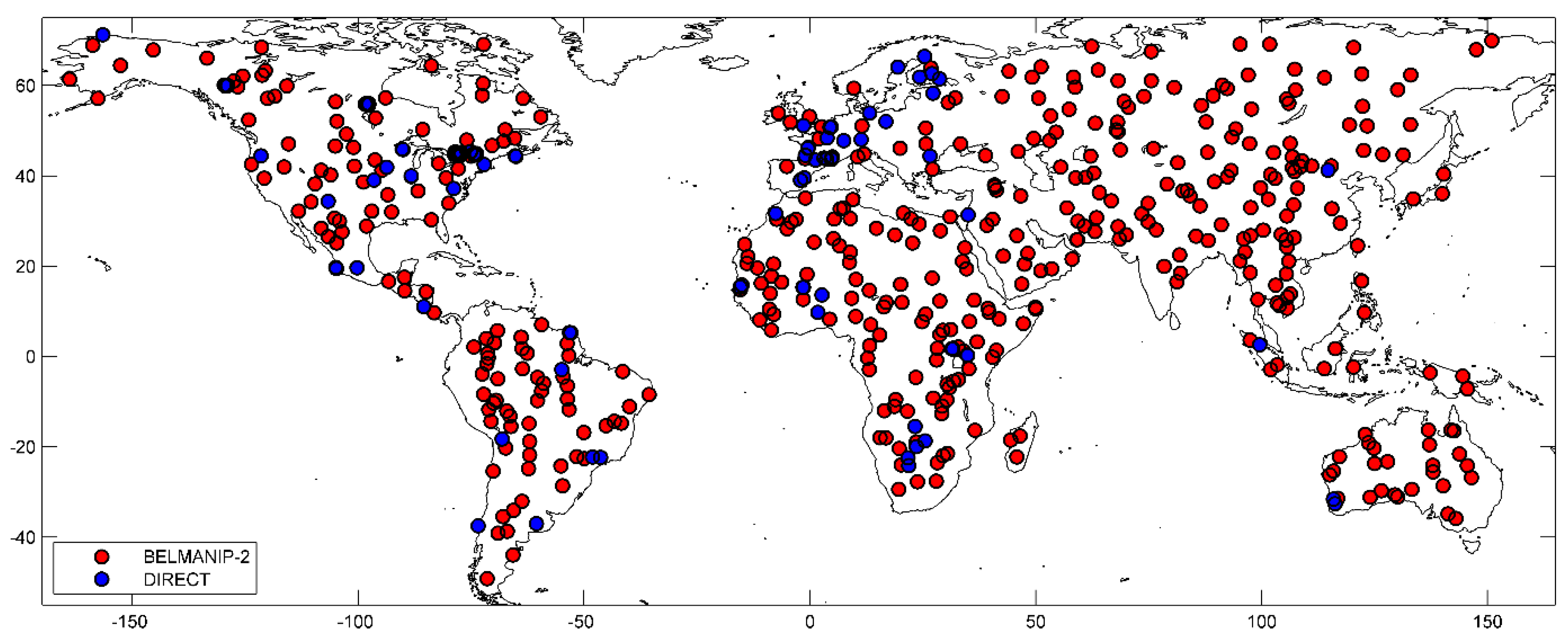 For calibration and validation purposes, a set of globally-distributed sites were selected. Two networks covering most land biomes were used: the BELMANIP2 network for calibration and the DIRECT network for validation. Figure 2 illustrates the global coverage and distribution of sites from both networks.