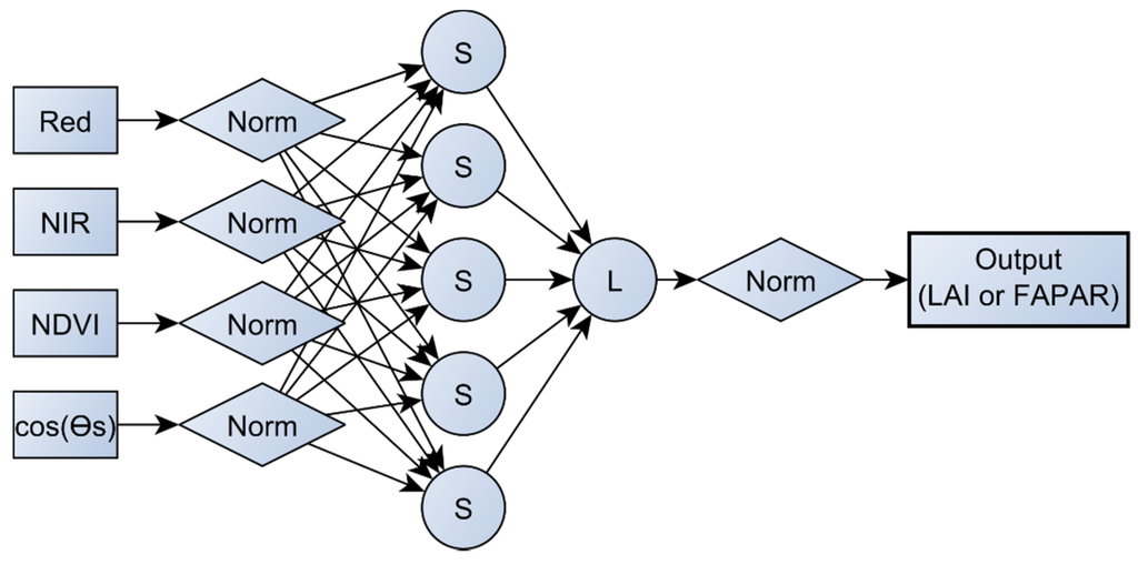 The AVH15 algorithm is based on an artificial neural network (ANN) connecting LAI or FAPAR to AVH09 SR products for each of the five biomes (omitting the water class) as defined in Section 2.3. The algorithm has five steps: