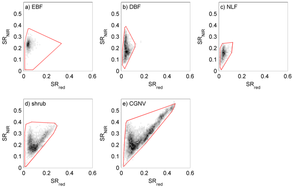 (a–e) Domain definition for the five classes (red polygons) in the red/NIR surface reflectance space. Greyscale images represent the density function for each 0.01 surface reflectance (SR) bin (white = no value; black = high density). Refer to Table 1 for biome class definitions. The domain definition is calculated using AVH09C1 data acquired from 2001 to 2007.