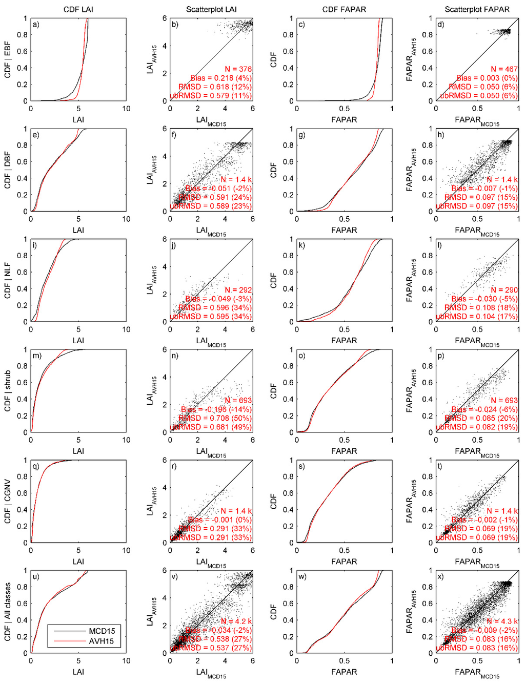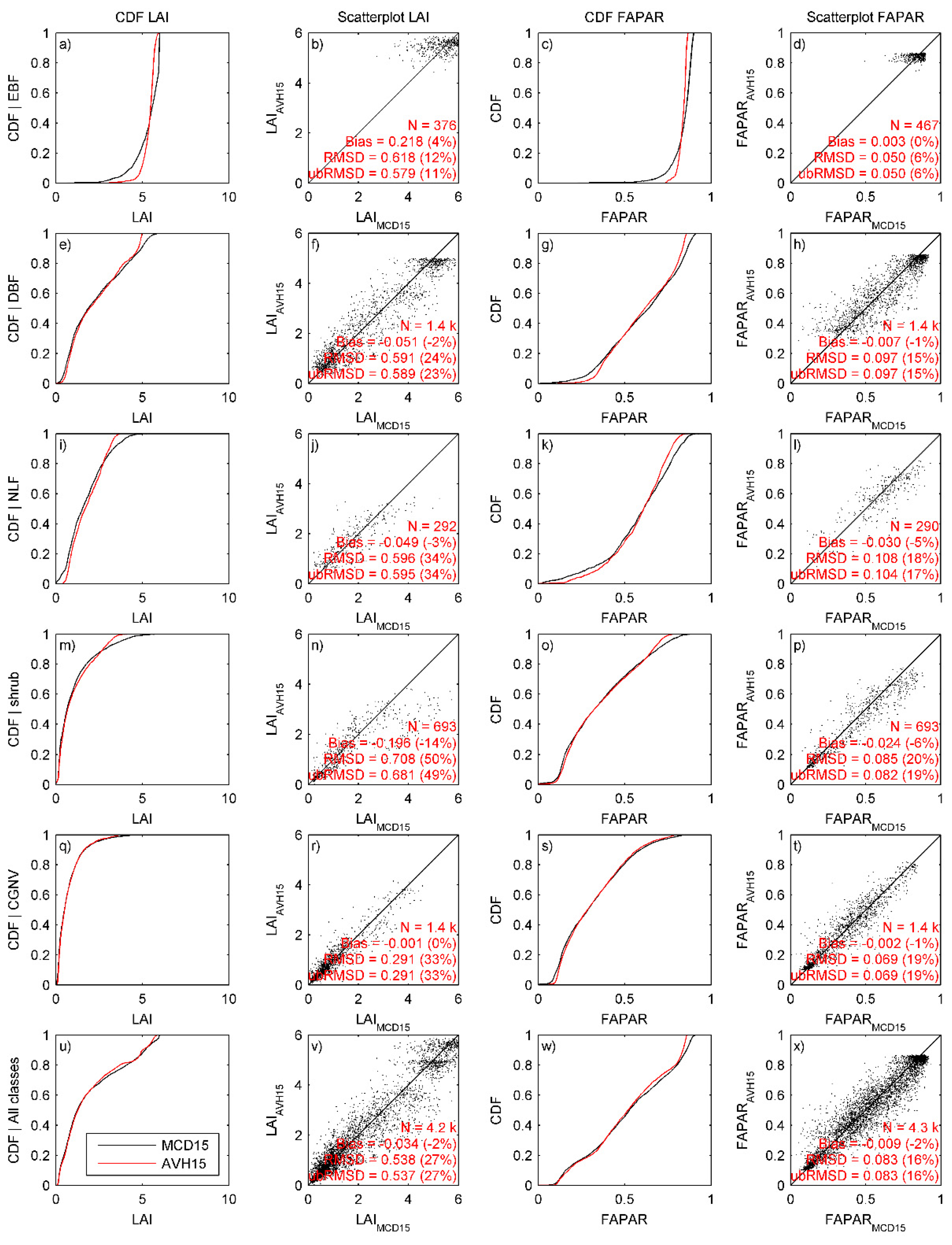(a–x) Theoretical performances of the LAI and FAPAR retrieval. Each row refers to a land cover class and the bottom row to all classes merged. On the first column, the cumulative distribution functions (CDF) of MCD15 training data and AVH15 LAI retrieval are shown. On the second column, scatter plots between LAI MCD15 (x-axis) and LAI AVH15 (y-axis) are displayed. The graphs are reproduced for FAPAR on the third and fourth column. Only data from DIRECT sites (not used for training) were plotted. Statistical metrics on the second and fourth subplot columns are defined in Equations (4)–(6); values in parenthesis correspond to metric values divided by the reference mean value. Refer to Table 1 for class biome definitions.