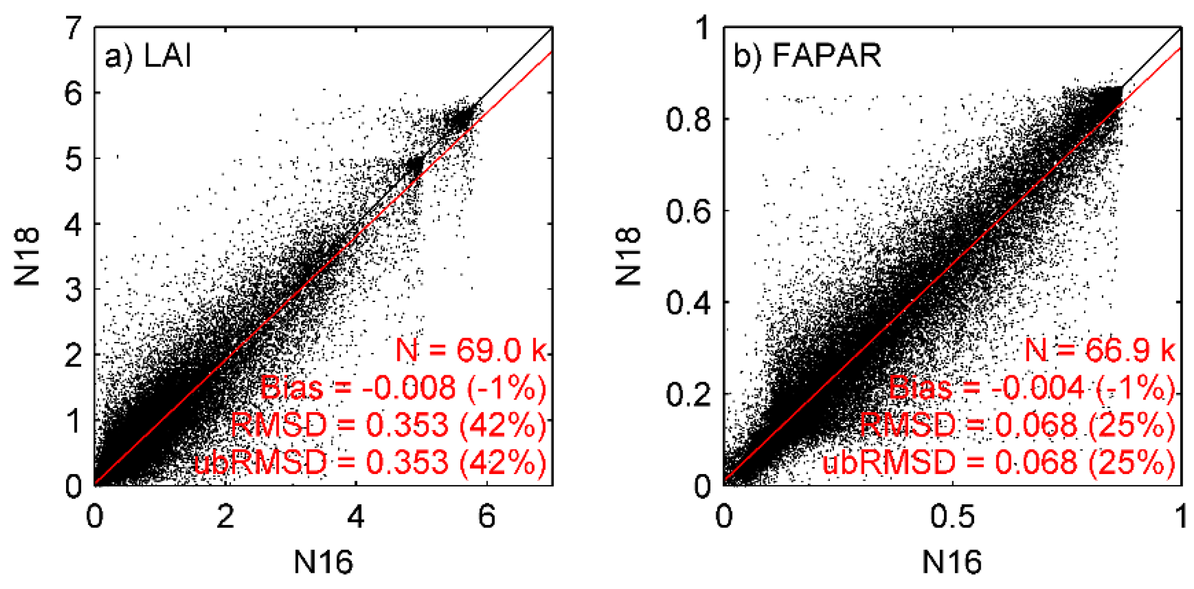 Another way to evaluate the reproducibility of the algorithm is to compare outputs from AVHRR sensors on board two different platforms. We selected NOAA-16 and NOAA-18, with an overlapping period from 2 July 2005 to 31 December 2006. The analysis is carried on BELMANIP2 and DIRECT sites. The resultant scatterplot is displayed in Figure 6. RMSD are 0.35 for LAI and 0.07 for FAPAR, which are comparatively better than the ANN performances computed in Figure 5l,x comparing AVHRR-derived to MODIS-derived LAI and FAPAR, respectively.