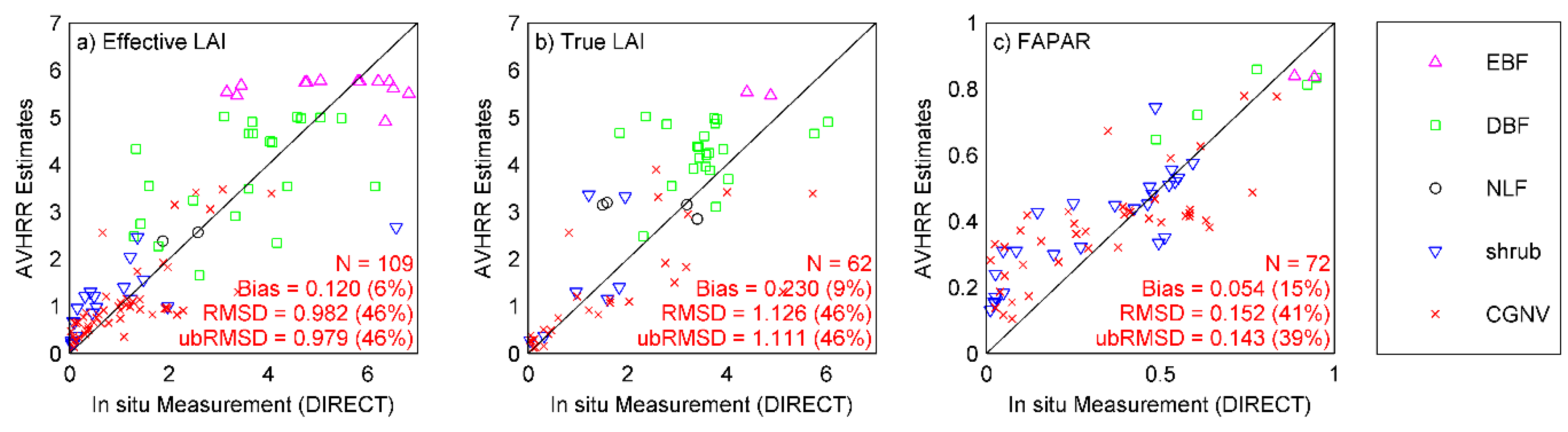 (a–c) In situ validation over DIRECT sites. Ground measurement covers initially a footprint of 3 km × 3 km and were extrapolated to 0.05° using MCD15 products for direct comparison. Statistical metrics are defined in Equations (4)–(6); values in parenthesis correspond to metric values divided by the reference mean value.