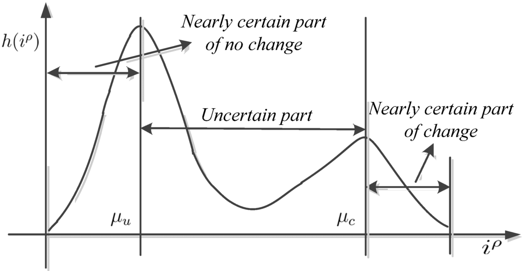 Several researchers recently focused on the fuzzy C-means (FCM) algorithm for remote sensing data change detection [,,,,]. FCM is the most popular fuzzy clustering method for image segmentation []; FCM provides a suitable tool for partitioning the difference image. First, FCM requires no selection or establishment of a probability statistical model for the distributions of changed and unchanged classes; such a lack of requirement indicates good prospects in application. Second, FCM has robust characteristics for ambiguity, and thus is more appropriate for discovering the changed and unchanged classes because the ranges of pixel values of difference image that belong to the changed and unchanged groups usually have overlaps. For example, when the difference image represents the absolute valued difference of two temporal images, an overlapping region is observed on the histogram of the difference image between the changed and unchanged groups [].