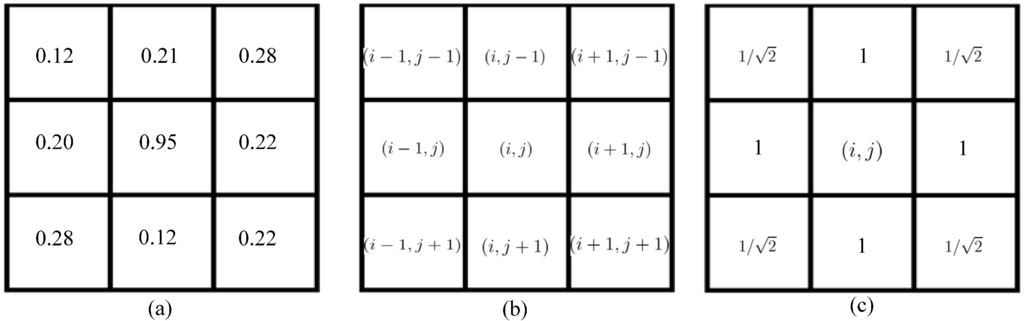 In expression Equation (21), we adopt the membership to replace the hard indicator function to describe the influence of neighboring pixels on the central pixel. The inverse distance is used, as the closer the neighbors from the center (i, j) are, the more influence they exert on the result and vice versa. With the proposed fuzzy spatial term Equation (21), unlikely or undesirable configurations in the membership functions can be discouraged. For instance, if the central pixel is corrupted by noise while its neighboring pixels are homogeneous, i.e., not corrupted by noise (Figure 3a), the undesirable membership grade of the noisy (central) pixel will converge to similar neighboring pixel membership degrees because of the addition of the fuzzy spatial term Equation (21).