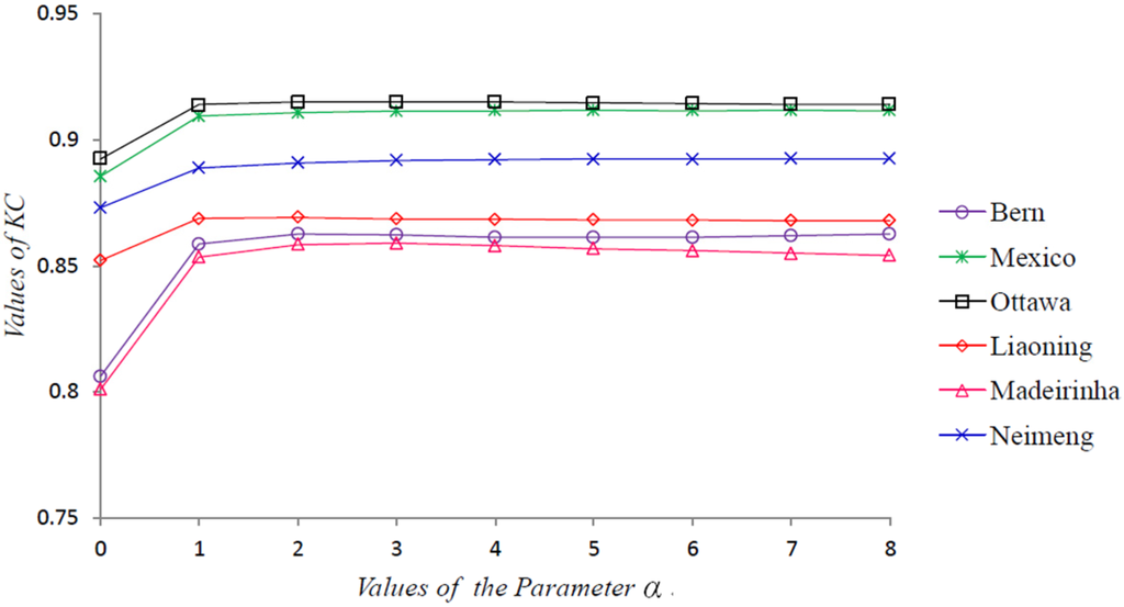 Based on the six curves, the value of KC increases conspicuously when the α-value changes from 0 to 1, whereas the KC value nearly stays constant in all the datasets when the α-value is larger than 1. The noticeable increase indicates that the utilization of labeling knowledge can significantly improve the performance of RSFCM. Moreover, the stability of KC under various α-values in the range of 1–8 shows that RSFCM is robust. That is, one can select any value in the range [,,,,,,,] for a reasonable performance of RSFCM for all the six datasets.