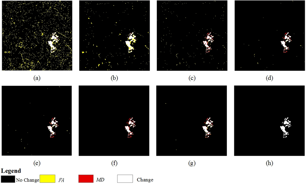 The dataset used in the fifth experiment is the Madeirinha dataset composed of two Landsat TM images with a size of 400 × 400 pixels acquired in July 2000 and July 2006 near Madeirinha, Brazil. Figure 5d–f shows band 3 of the images and the ground truth of the fifth dataset, respectively.