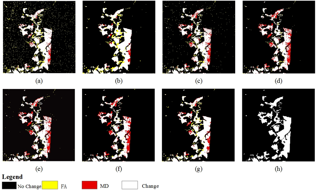 As shown in Figure 7, Figure 8, Figure 9, Figure 10, Figure 11 and Figure 12, six methods provide different change maps over the same geographical area. The change detection maps yielded by EM contain many yellow noise spots (Figure 7, Figure 8, Figure 9, Figure 10, Figure 11 and Figure 12a) and have the largest (worst) FA (Table 1, Table 2, Table 3, Table 4, Table 5 and Table 6). This is mainly because EM fails to consider any information on the spatial context in the process of the difference image analysis. By incorporating the information provided by the neighboring pixels, the EMMRF algorithm greatly improves the EM change detection results. Most of the noise is removed (Figure 7, Figure 8, Figure 9, Figure 10, Figure 11 and Figure 12b), and the value of FA significantly decreases (Table 1, Table 2, Table 3, Table 4, Table 5 and Table 6). As an example, for the Bern data, the FA value decreases from 4785 to 1088 (Table 1). However, the detecting results from the EMMRF are still not satisfactory enough compared to the reference maps (Figure 7, Figure 8, Figure 9, Figure 10, Figure 11 and Figure 12b). The two major reasons for this are that, (1) EMMRF is a post-processing of the EM change detection, and its results depend on the EM results; and (2) the EMMRF algorithm (similar to EM) is developed based on the classical set theory and does not work well on separating the overlapping unchanged and changed clusters.