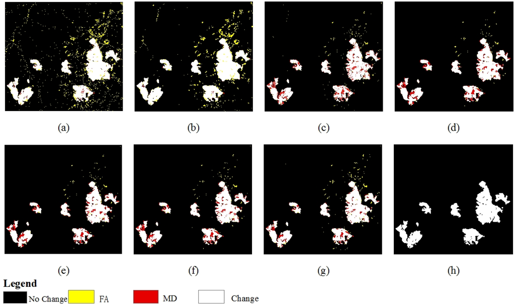 Final change detection maps of the Mexico dataset produced by (a) EM; (b) EMMRF; (c) FCM; (d) FLICM; (e) RFLICM; (f) sRSFCM; (g) proposed RSFCM; and (h) reference image.