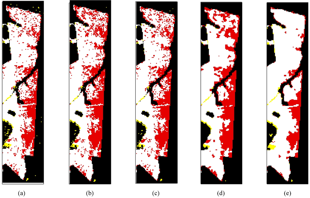 Notably, in the first step of the proposed change detection approach, other thresholding algorithms such as Kapur can be used to take the place of EM for obtaining nearly certain pixel-patterns. In the second step, some universal models such as the spatial attraction model can be used to define the fuzzy spatial term for modifying the membership.