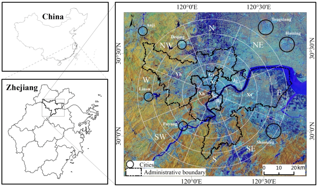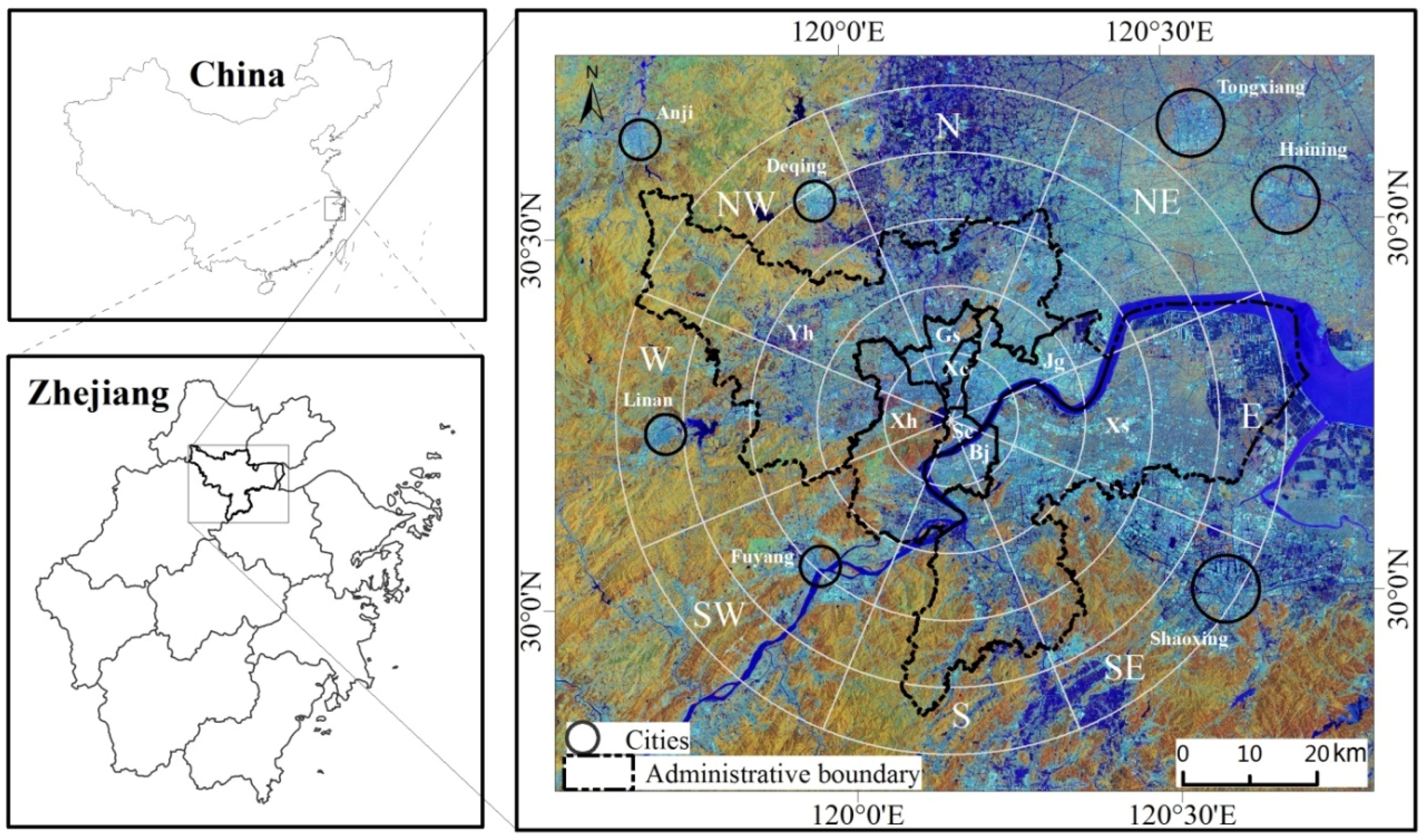 Study area Hangzhou metropolis, a coastal region in Zhejiang province, China, and the strategy of analyzing impervious surface distribution and its dynamic change with the buffer zone-based approach in different directions. (There are eight administrative units: Yh–Yuhang; Xs–Xiaoshan; Xh–Xihu; Jg–Jianggan; Bj–Binjiang; Gs–Gongshu; Sc–Shangcheng; Xc–Xiacheng. The circles are shown at 10 km intervals for simplification).