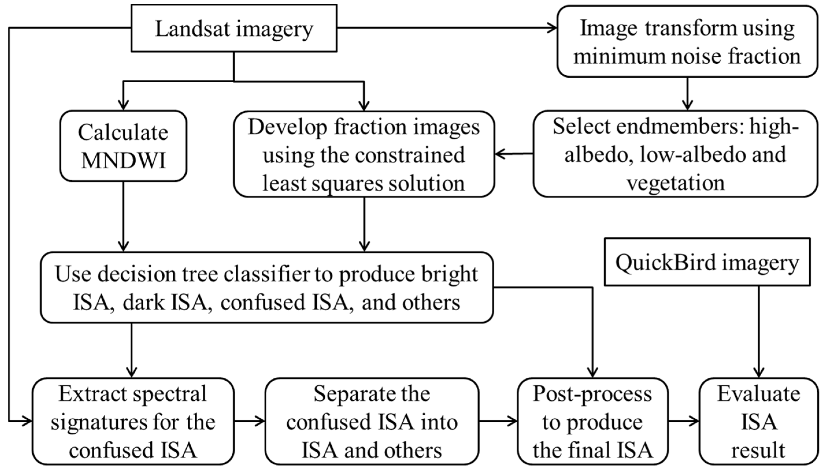 Framework of mapping impervious surface distribution from Landsat multispectral image. (Note: MNDWI, modified normalized difference water index; ISA, impervious surface area; final ISA is the combination of bright ISA, dark ISA, and other ISA separated from the confusion).