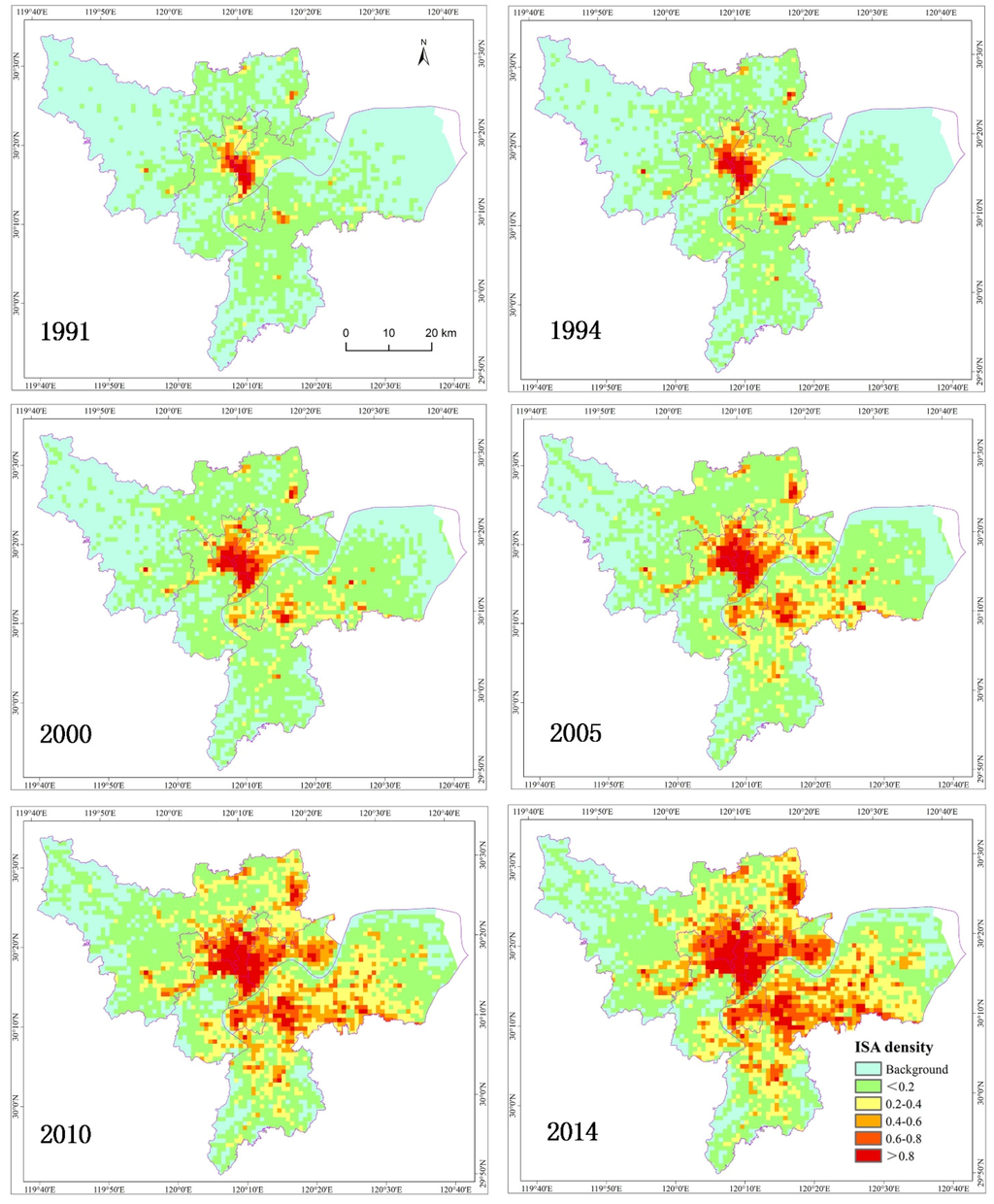 This hybrid approach was used to map ISA distributions separately for the years between 1991 and 2014. In order to further improve ISA mapping performance, the time series ISA distribution data were further examined by checking areas that appeared to have changed between two image dates. For example, generally speaking, if the pixels were ISA in 2010, they should be ISA in 2014; if not, these pixels were visually examined and modified if needed. Sometimes this assumption is not true due to redevelopment of urban areas; that is, the reconstruction of old residential areas might convert urban ISA to grass (a new park).
