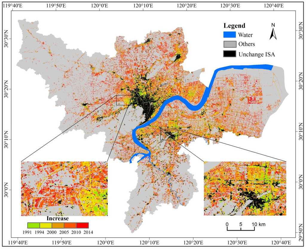 Pixel-based change detection is often based on the comparison of classified images at different dates [25]. This research also used the classification-based comparison approach to examine ISA expansion based on the developed ISA images between 1991 and 2014. Average annual ISA change rate (km2/year) was calculated to analyze urbanization rates at temporal scale.