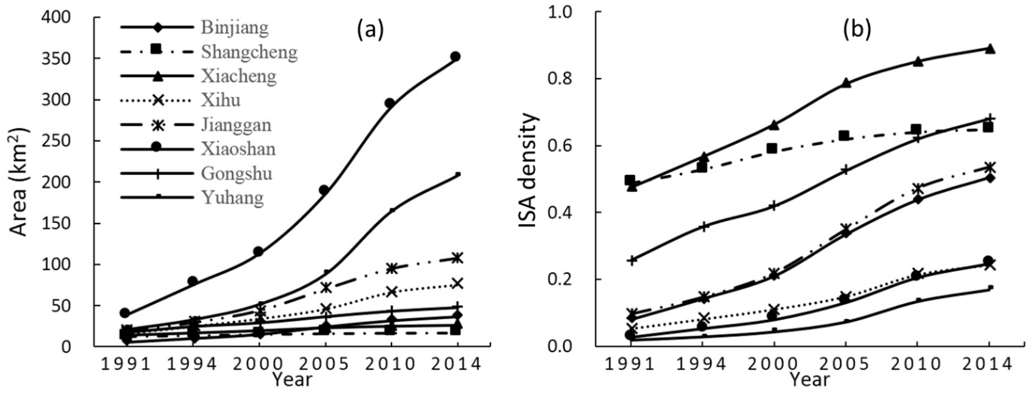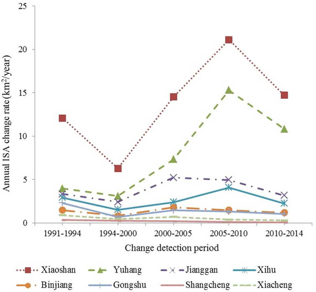 Overall, ISA in Hangzhou metropolis increased rapidly from 146 km2 in 1991 to 868 km2 in 2014 (Table 3). Since entering the 21st century, annual ISA growth rate has been over 33 km2 and as high as 49 km2 in 2005–2010; in contrast, it was only 16 km2 in 1994–2000. There are eight districts in Hangzhou metropolis (see Figure 1). Xiaoshan, located at the east and south sides with flat terrain, has the highest annual ISA growth rate, followed by Yuhang, with flat terrain in the north and northeast and mountains in the west. The core urban regions in Binjiang, Gongshu, Shangcheng, and Xiacheng have very low ISA growth rates (see Figure 6).