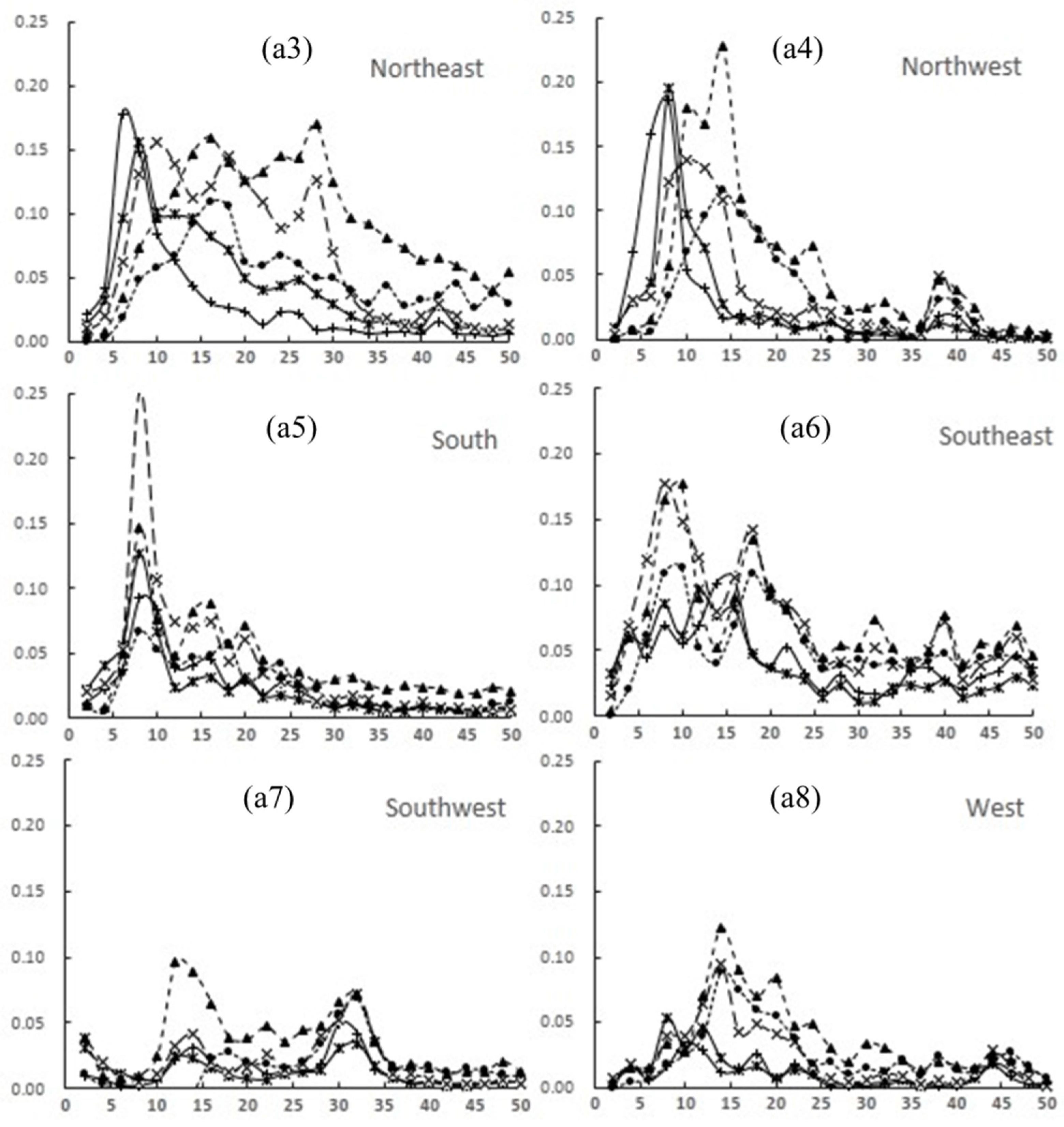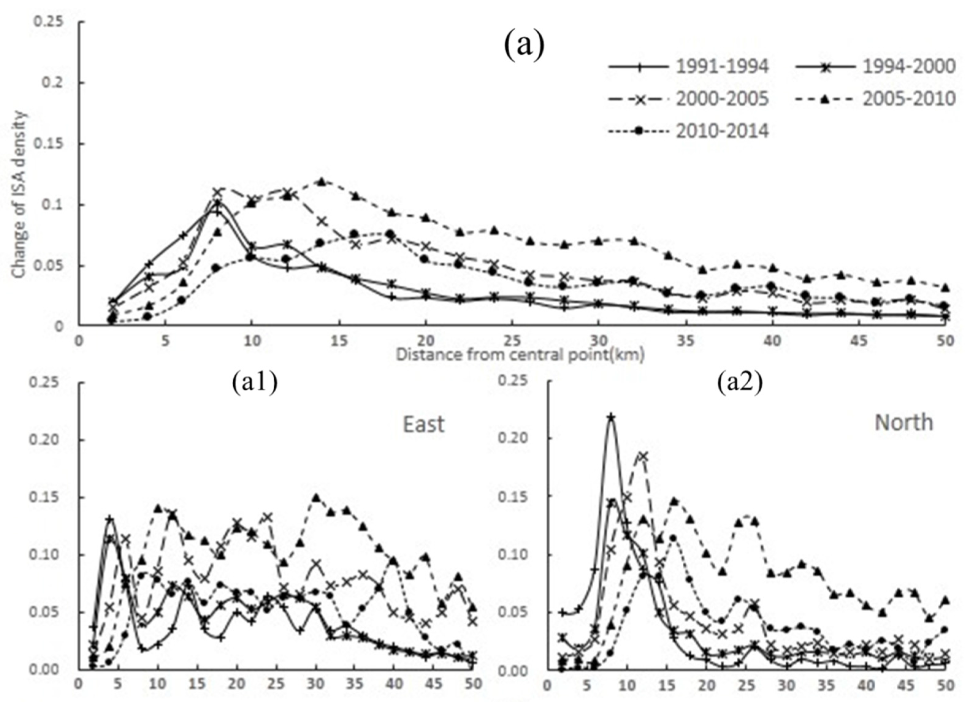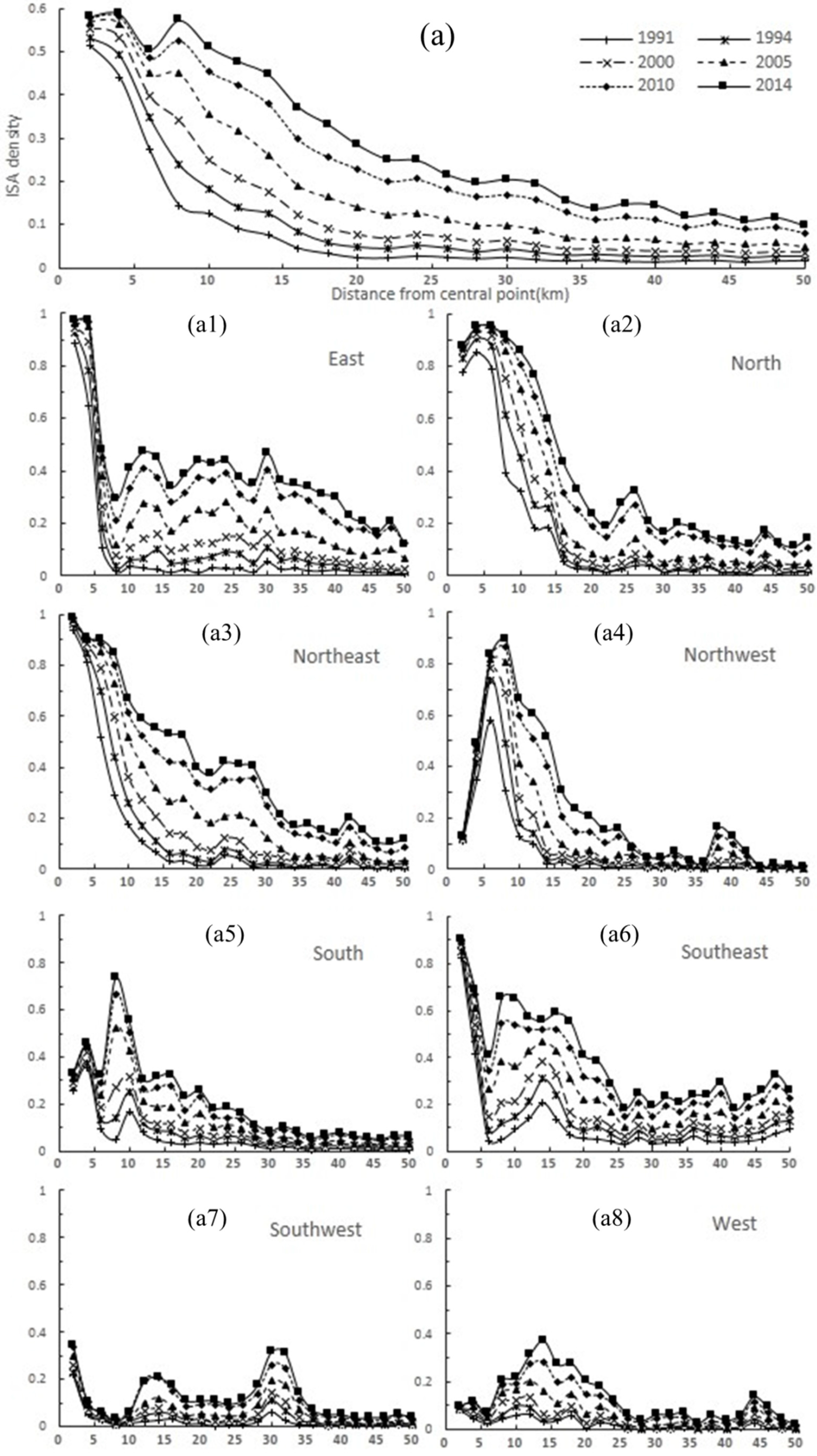 Analysis of Figure 7a is based on the ISA values of buffer zones at 2 km intervals from the urban center to a distance of 50 km from 1991 to 2014, but this result did not reflect the spatial patterns of ISA density distributions in different directions. Therefore, Figure 7a1–a8 illustrates the ISA density distribution in eight directions in order to understand different spatial patterns of ISA density distribution in various regions.