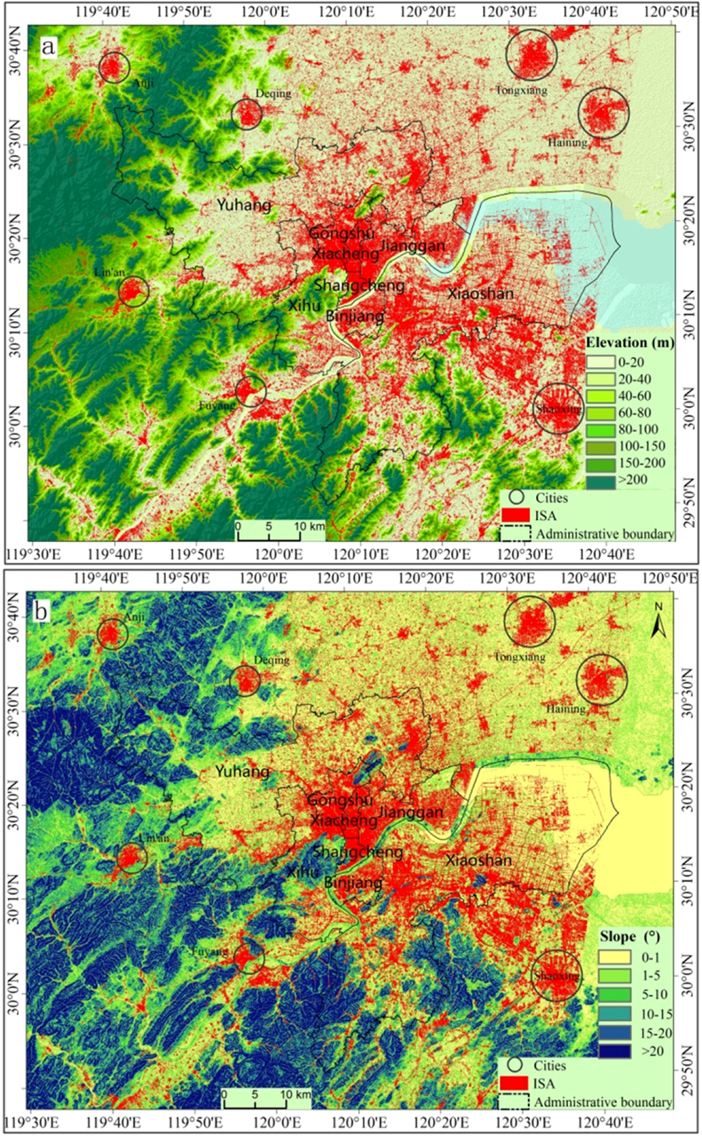 Impacts of topographic factors—elevation (a) and slope (b) on impervious surface area (ISA) distribution (Note: ISA data were developed from the 2014 Landsat 8 OLI imagery, and elevation and slope are from ASTER GDEM data.)