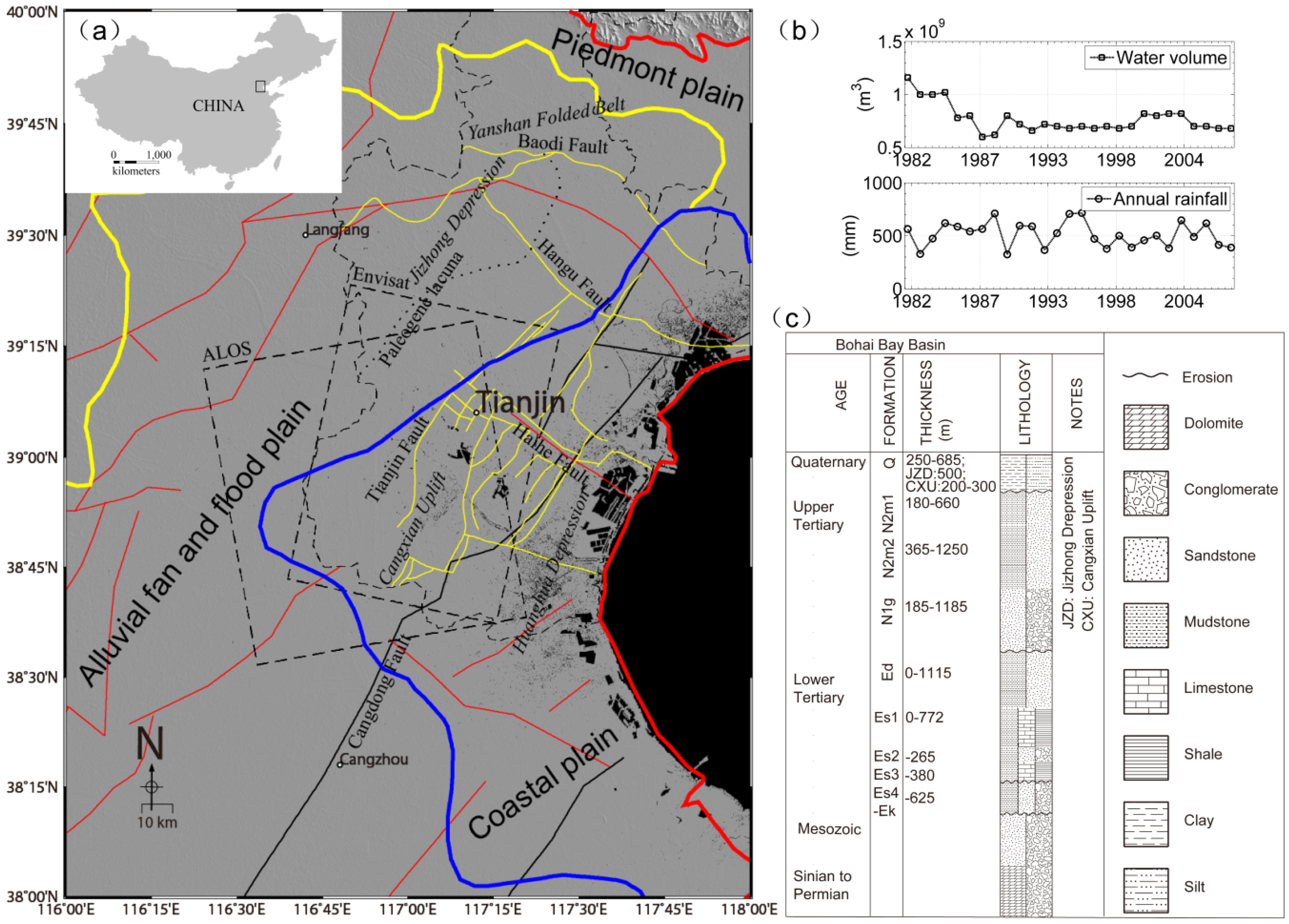 (a) The tectonic framework of the Northern China Plain. Boundary of North China Plain is in thick red line. Piedmont plain, alluvial fan and flood plain, and coastal plain in North China Plain are bounded by thick yellow and blue lines. Major faults and subsidiary faults in North China Plain are shown in thin black and red solid lines, respectively [19]. Palaeogene lacuna (missing line of Paleogene system) is in thin dotted line, while further details of the fault system in Tianjin are shown by thin yellow solid lines [20]. Locations of major cities in this area are shown. Envisat ASAR frame, ALOS PALSAR frame, and political boundary of Tianjin are outlined with dashed lines; (b) Annual groundwater pumping volume and rainfall in Tianjin City from 1980 to 2007 (after [5]); (c) Stratigraphy in Bohai Bay Basin (after [21,22,23]). The upper Tertiary formations can be divided into Neogene Minghuazhen (Nm) and Guantao (Ng) groups. The lower Tertiary formations can be divided into Eogene Dongying (Ed), Shahejie (Es), and Kongdian (Ek) formations.